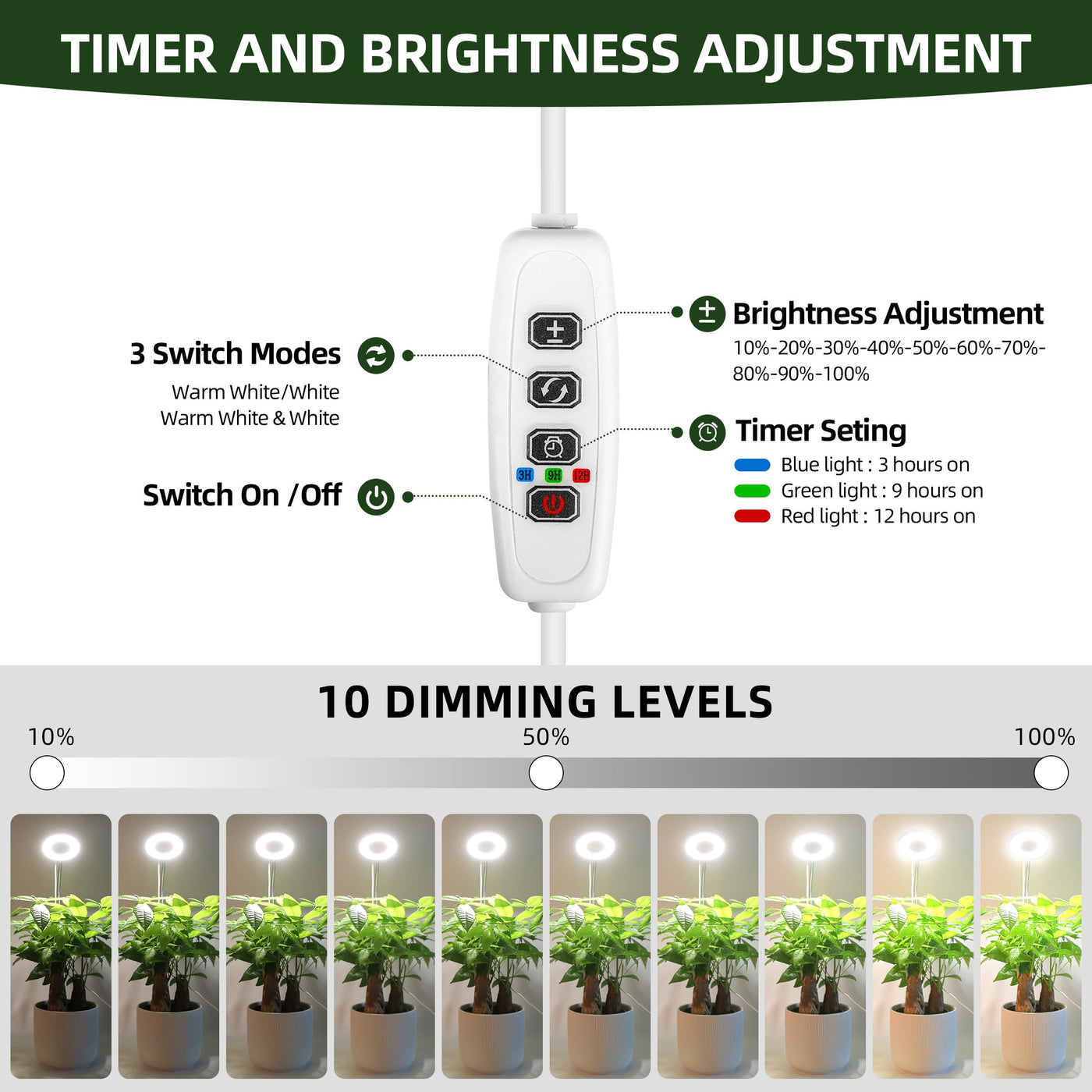 Q: How many lighting modes and dimming levels does this grow light have?A: This grow light offers 3 lighting modes: white light, warm white light, and a combination of both. Additionally, it provides 10 dimming levels to help you adjust the light intensity based on your plants' specific growth needs and environmental conditions.