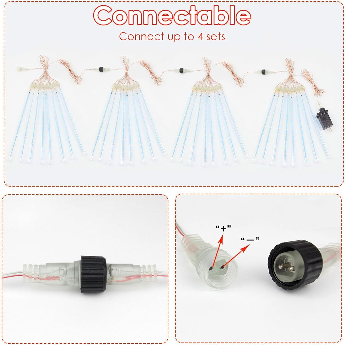 Q: Can I connect multiple sets of these lights together?A: Yes, the Meteor Shower Lights feature male and female connectors, allowing you to connect up to four sets together for extended display options.