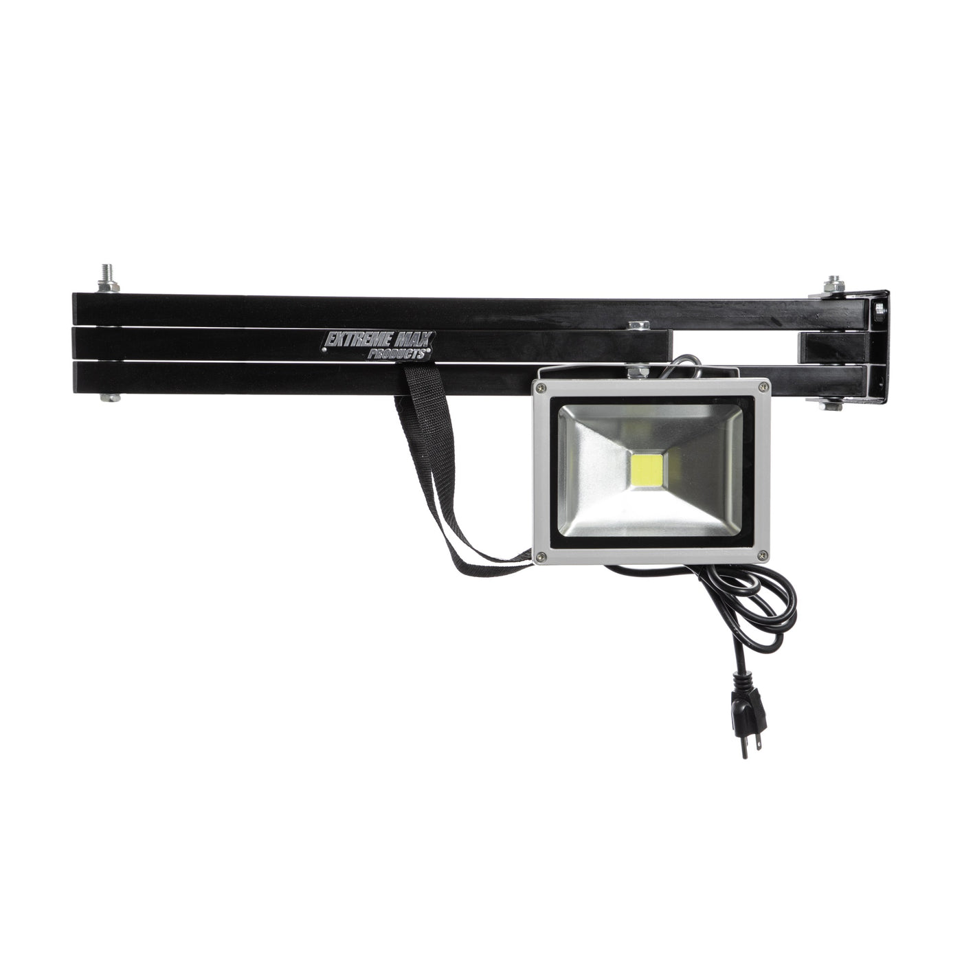 The Extreme Max Swing Arm LED Flip Out Light is designed for installation in workshops and race trailers, providing a brilliant lighting to nearly any style workplace. The swing arm design offers precise light direction that is easier to use than a trouble light and more adjustable than a static overhead work light. The light is powered by any standard 120V outlet. The light also includes a leash to secure the light during travel.