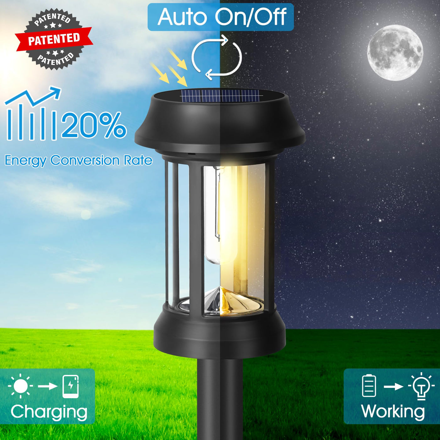 Q: How long do Eyrosa Solar Pathway Lights last on a full charge?A: The Eyrosa Solar Pathway Lights can glow continuously for 8-10 hours after charging for 6-8 hours in sunlight.