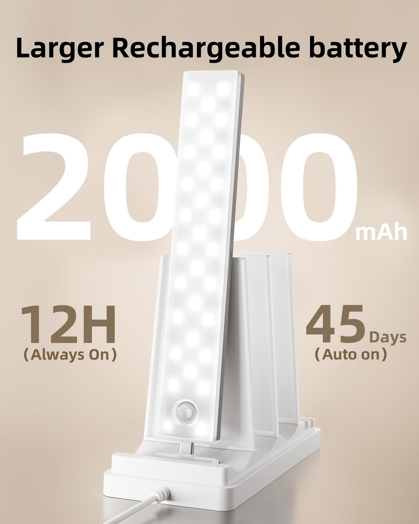 - **Long Battery Life & Convenient Charging Station**: Equipped with a powerful 2000mAh rechargeable battery, these under cabinet lights can last up to 45 days on Auto Mode and 12 hours on Always-On Mode at full brightness. The included charging dock can charge three lights simultaneously, making it a tidy and functional addition to any space.