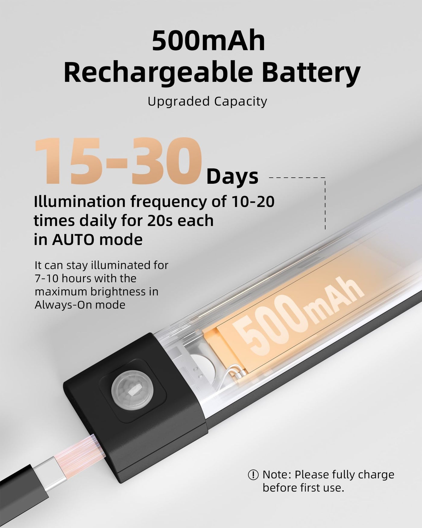 Q: How long does the battery of the EZVALO Closet Lights last?A: The 500mAh rechargeable battery can last for 15-30 days in AUTO mode, assuming an illumination frequency of 10-20 times daily for 20 seconds each. In Always-On mode, the lights can stay illuminated for 4-5 hours at maximum brightness.