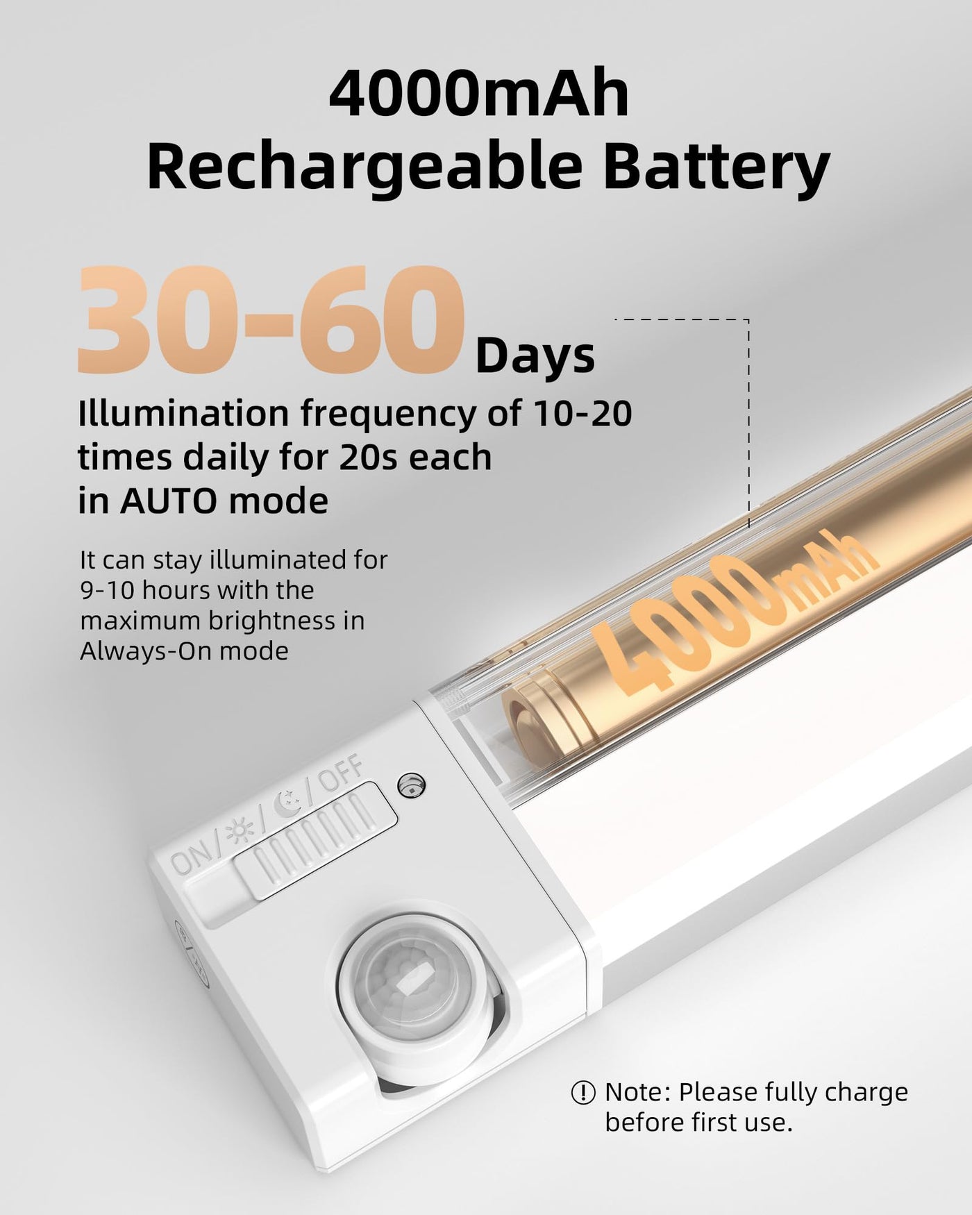 - **4000mAh Larger Battery**: Featuring a powerful 4000mAh rechargeable battery, this under cabinet lighting system offers extended endurance compared to competitors. Enjoy 30-60 days of use with an illumination frequency of 10-20 times daily for 20 seconds each in AUTO mode, or 9-10 hours of continuous light in Always-On mode. (Ensure full charge before first use.)