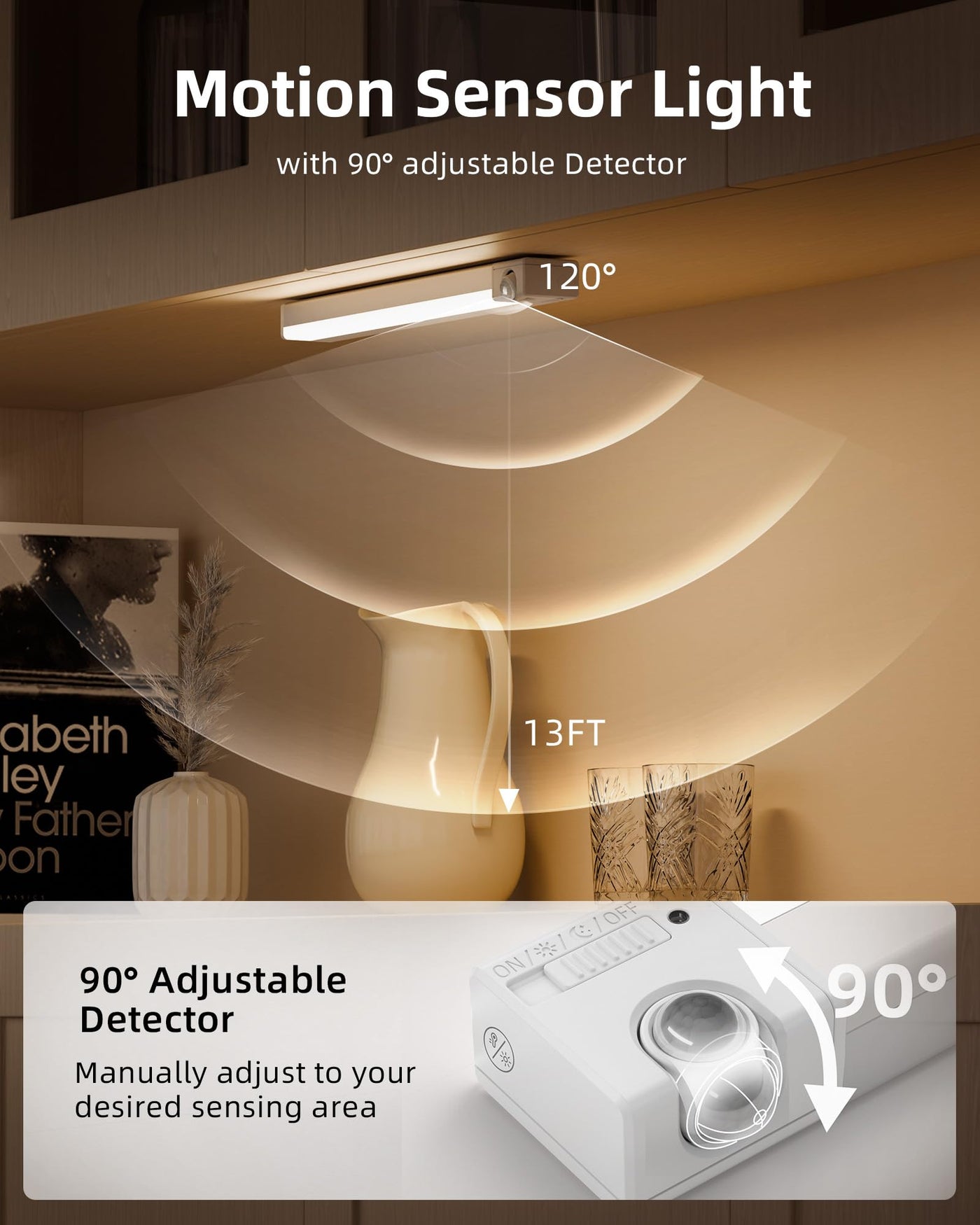 Q: How does the motion sensor work on the EZVALO Under Cabinet Lights?A: The EZVALO Under Cabinet Lights feature a 120° wide-angle motion sensor that activates the light within a 13 ft range. It operates in both Day Mode, which activates the light in any lighting condition, and Night Mode, which only triggers in dark environments.