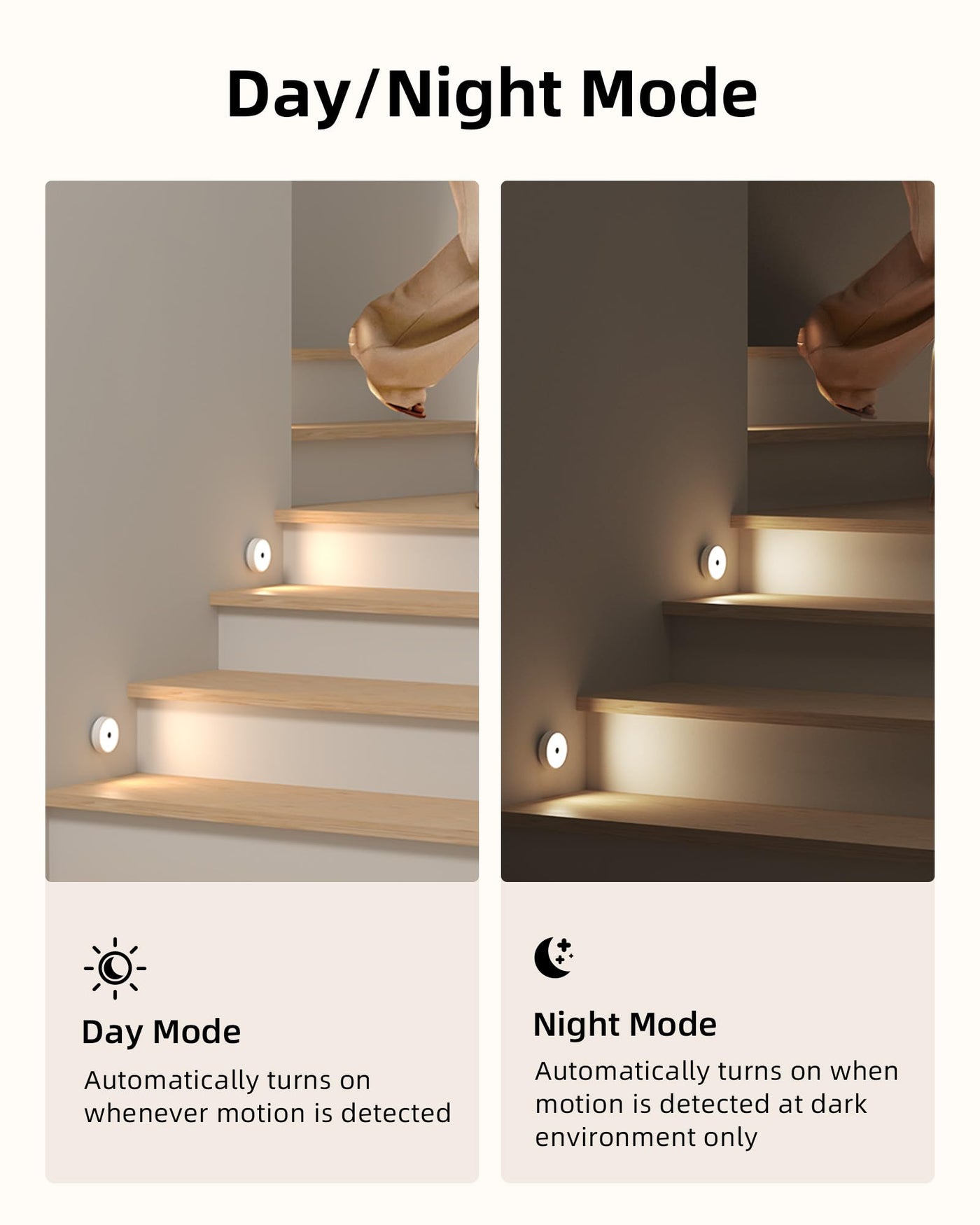 - **PIR Motion Sensor & Group Control**: Automatically activates when motion is detected in low-light conditions, covering a 120° range up to 10 feet. The lights turn off 25 seconds after the last movement, ensuring energy efficiency. Easily control multiple lights in unison with group control functionality, eliminating the need to adjust each light individually.