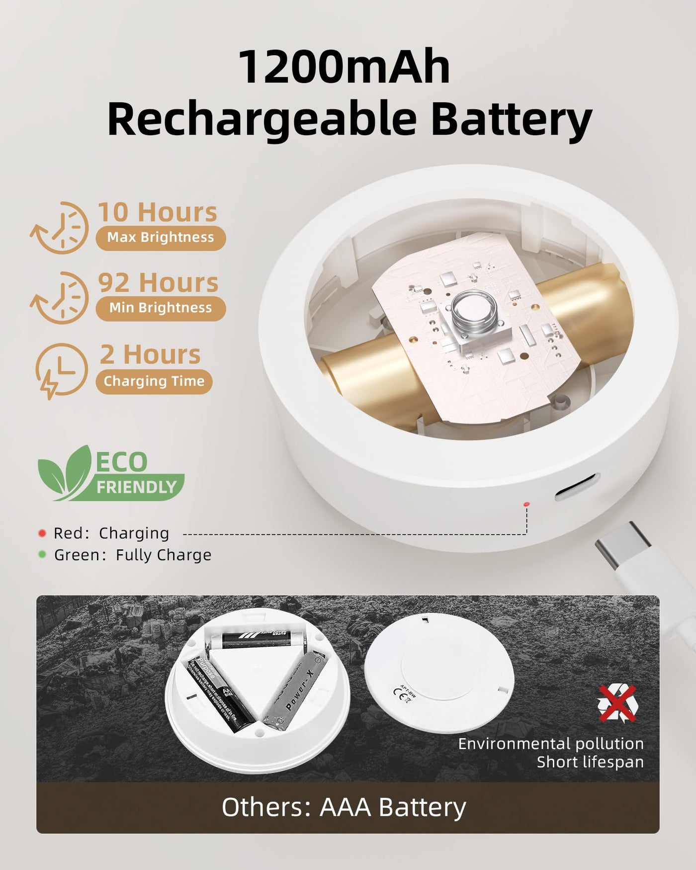 - **1200mAh Rechargeable Battery**: Equipped with a high-capacity rechargeable battery, these puck lights can illuminate your space for up to 92 hours on the lowest brightness setting. Enjoy quick charging with the included Type-C cable, reaching a full charge in just 2 hours.