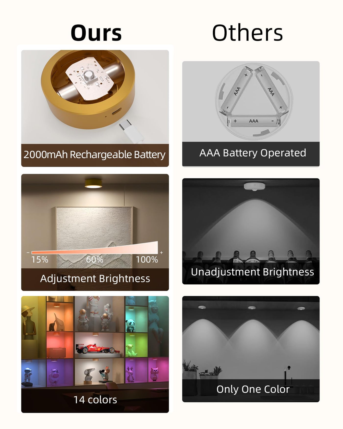 These puck lights are equipped with a rechargeable 2000mAh battery, eliminating the need for frequent AAA battery replacements. When fully charged, the lights provide 5-6 hours of illumination, allowing for extended use without constant recharging. The stepless dimming feature allows users to easily adjust brightness levels from 10% to 100%, delivering up to 100 lumens of light, ensuring safety in darker areas.