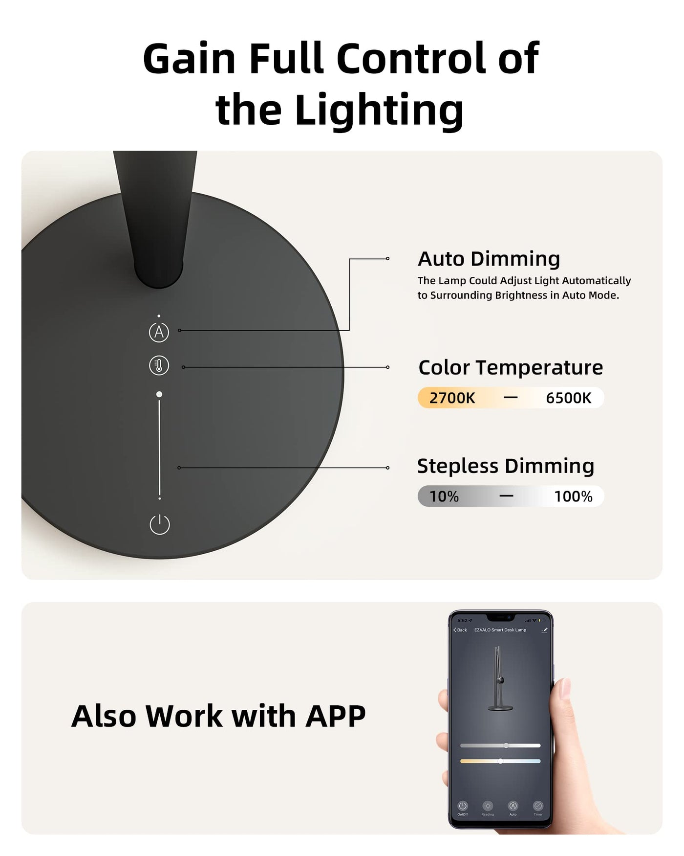 EZVALO Smart Desk Lamp - Auto-Dimming LED, 3 Color Temperatures, APP Control, Works with Alexa & Google Assistant, Black, Model LETD01