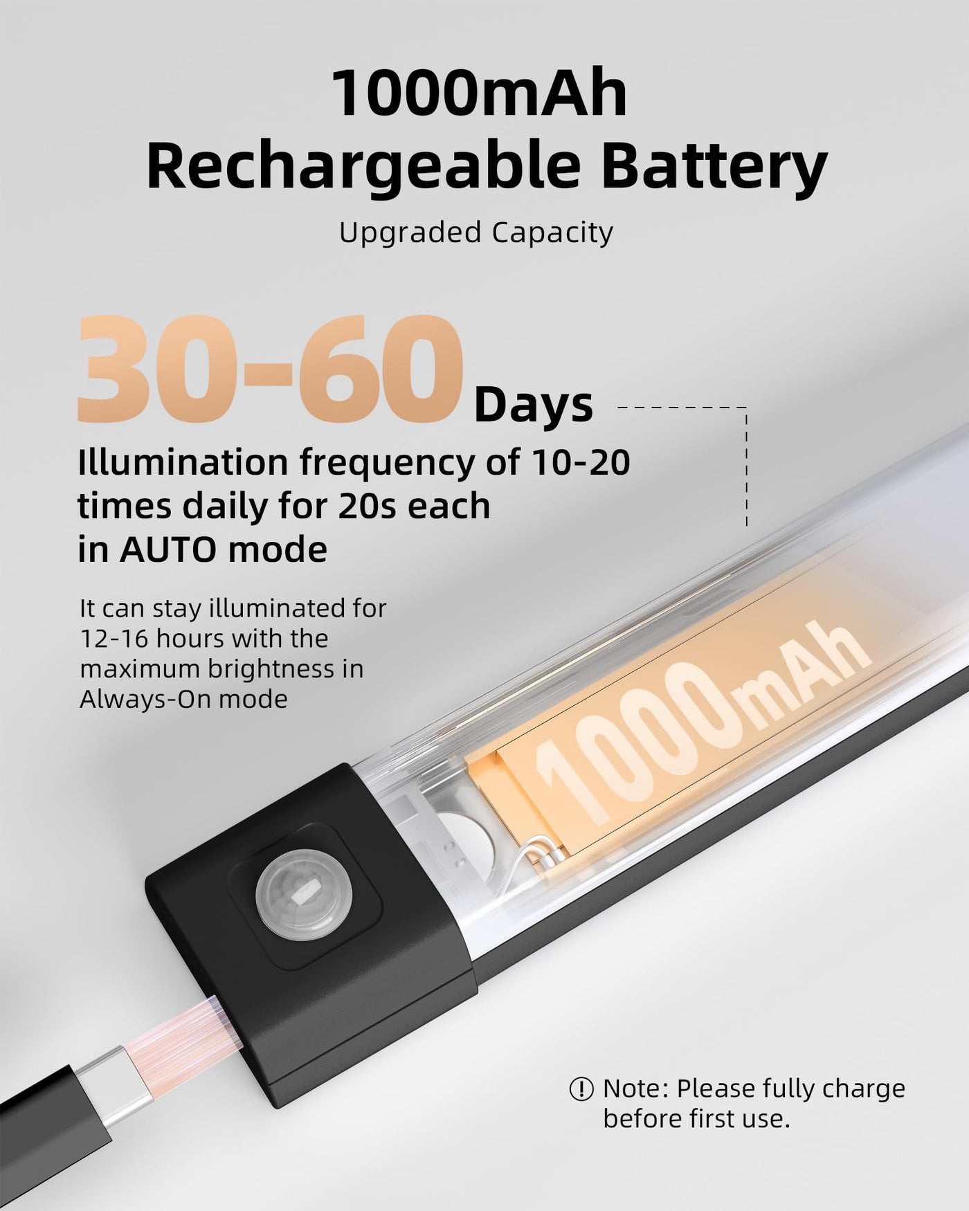 Q: How long does the battery last on a single charge?A: The 1000mAh rechargeable battery can last between 30 to 60 days in AUTO mode, depending on usage frequency. In Always-On mode, it can provide illumination for 12 to 16 hours at maximum brightness.