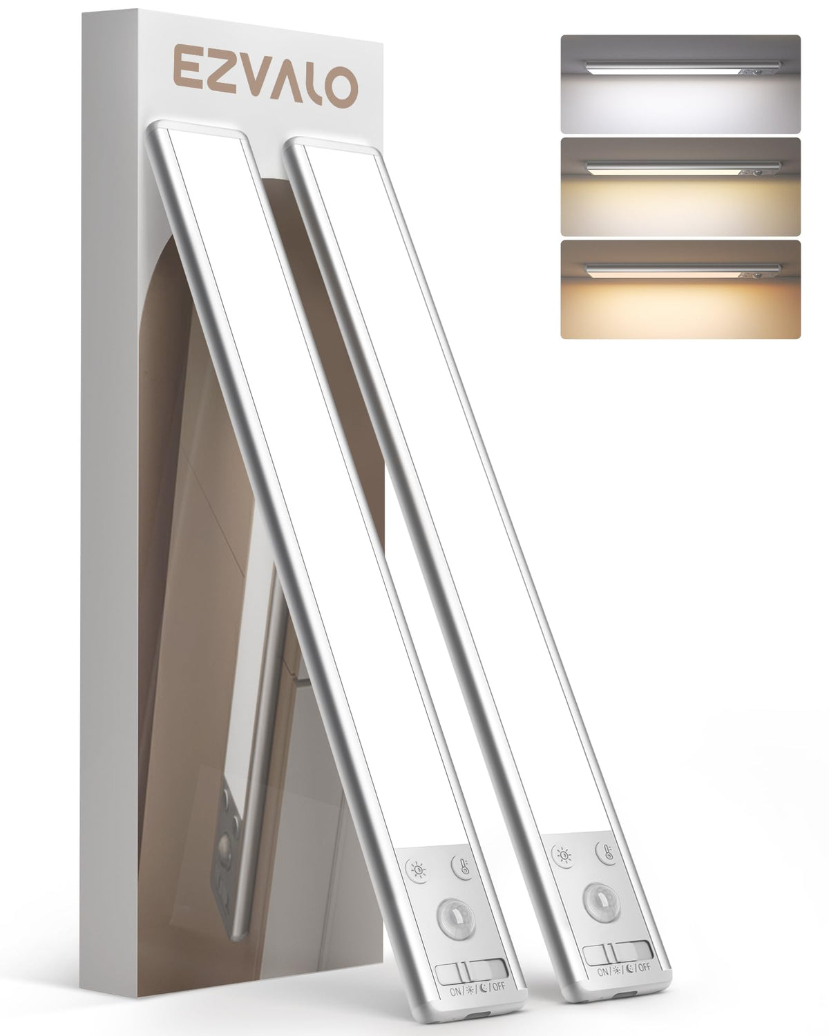 Q: What are the color temperature options available for the EZVALO Under Cabinet Lights?A: The EZVALO Under Cabinet Lights offer three color temperature options: Warm Light (3000K), Natural Light (4200K), and Cool White (6500K). This allows you to choose the ideal lighting for various activities or moods.