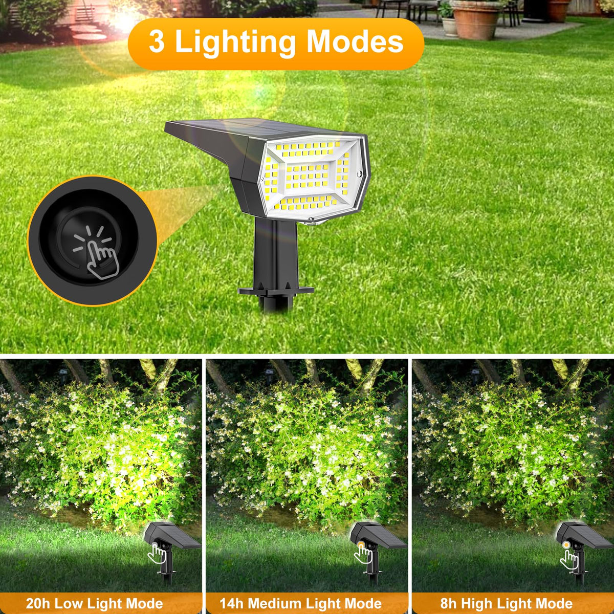 Q: What are the different brightness modes available?A: These solar lights come with three brightness modes: low (20 hours), medium (14 hours), and high (8 hours). You can easily switch between these modes with a simple button press, allowing you to customize the lighting according to your needs.