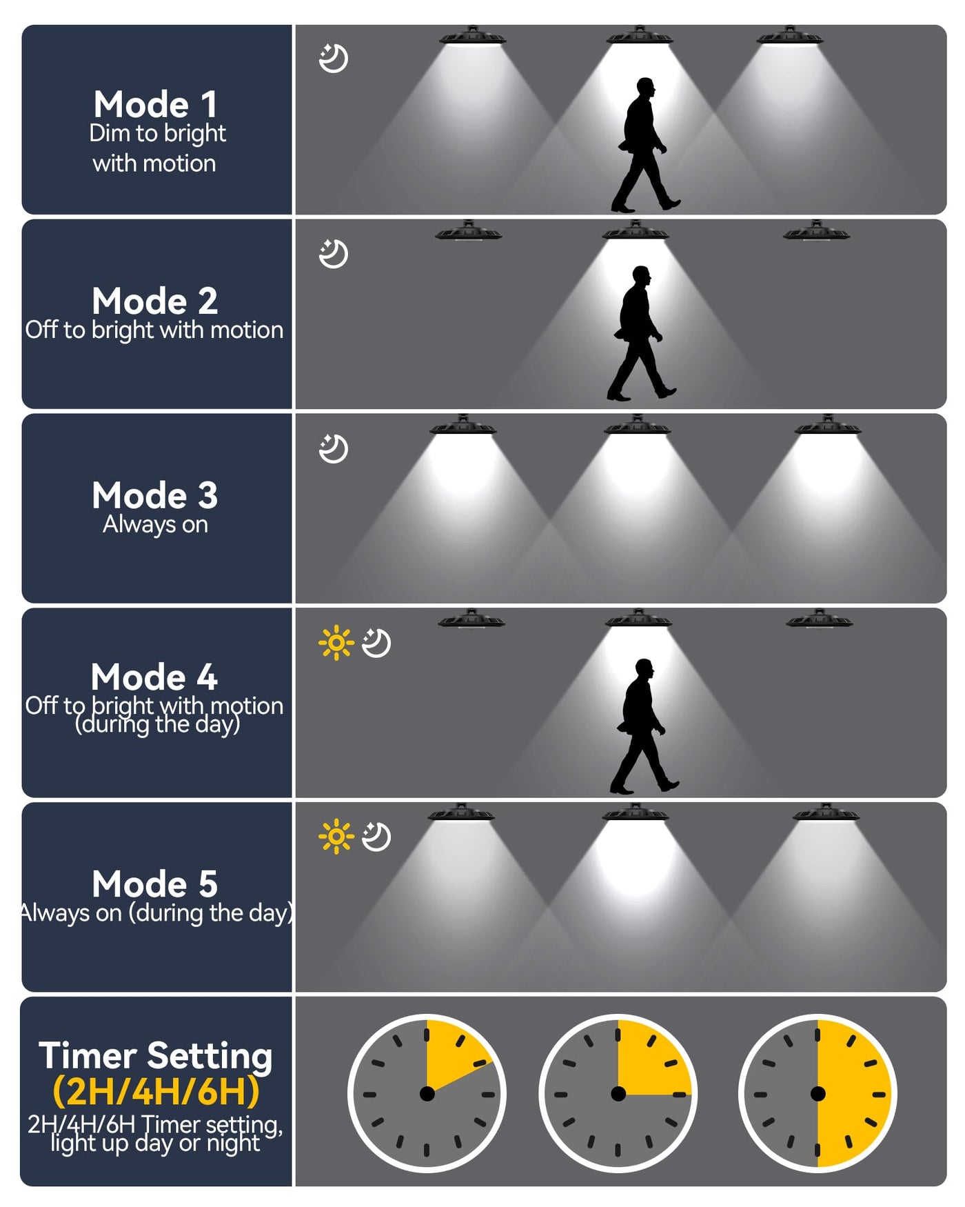 Q: How does the motion sensor feature work on this solar light?A: The motion sensor feature of the FabStyl Dual Head Solar Light includes five different lighting modes. It can dim to bright when motion is detected, turn on from off when motion is sensed at night, stay always-on at night, activate from off during the daytime upon sensing motion, or keep the light on all day. This functionality ensures energy efficiency while providing illumination when needed.