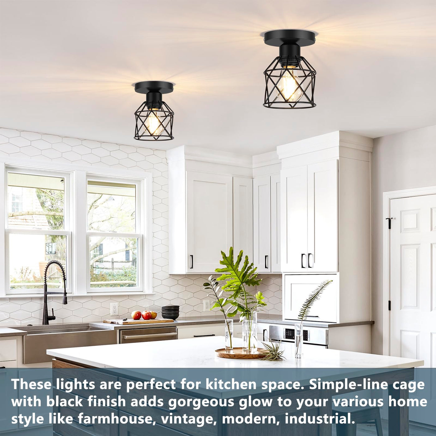 FadimiKoo Semi Flush Mount Ceiling Light, Black Metal Cage, 2-Pack, Indoor Fixtures for Kitchen, Porch, Bedroom