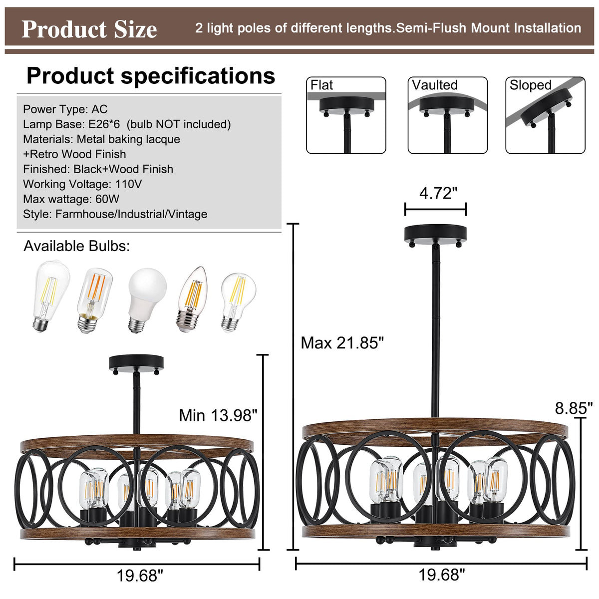 Q: What type of bulbs does the Faibra 6-Light Farmhouse Drum Pendant Light require?A: The Faibra 6-Light Farmhouse Drum Pendant Light requires six E26 base bulbs, each with a maximum power of 60W. This allows for easy replacement and the option to use dimmable bulbs with a compatible dimmer switch for adjustable lighting.