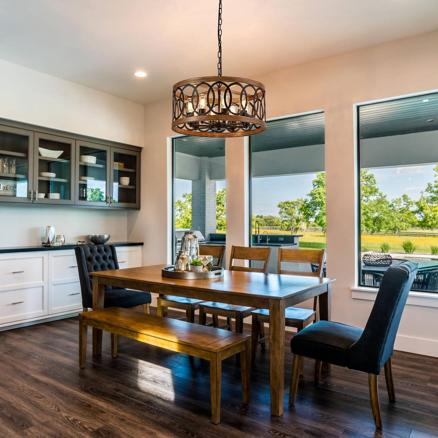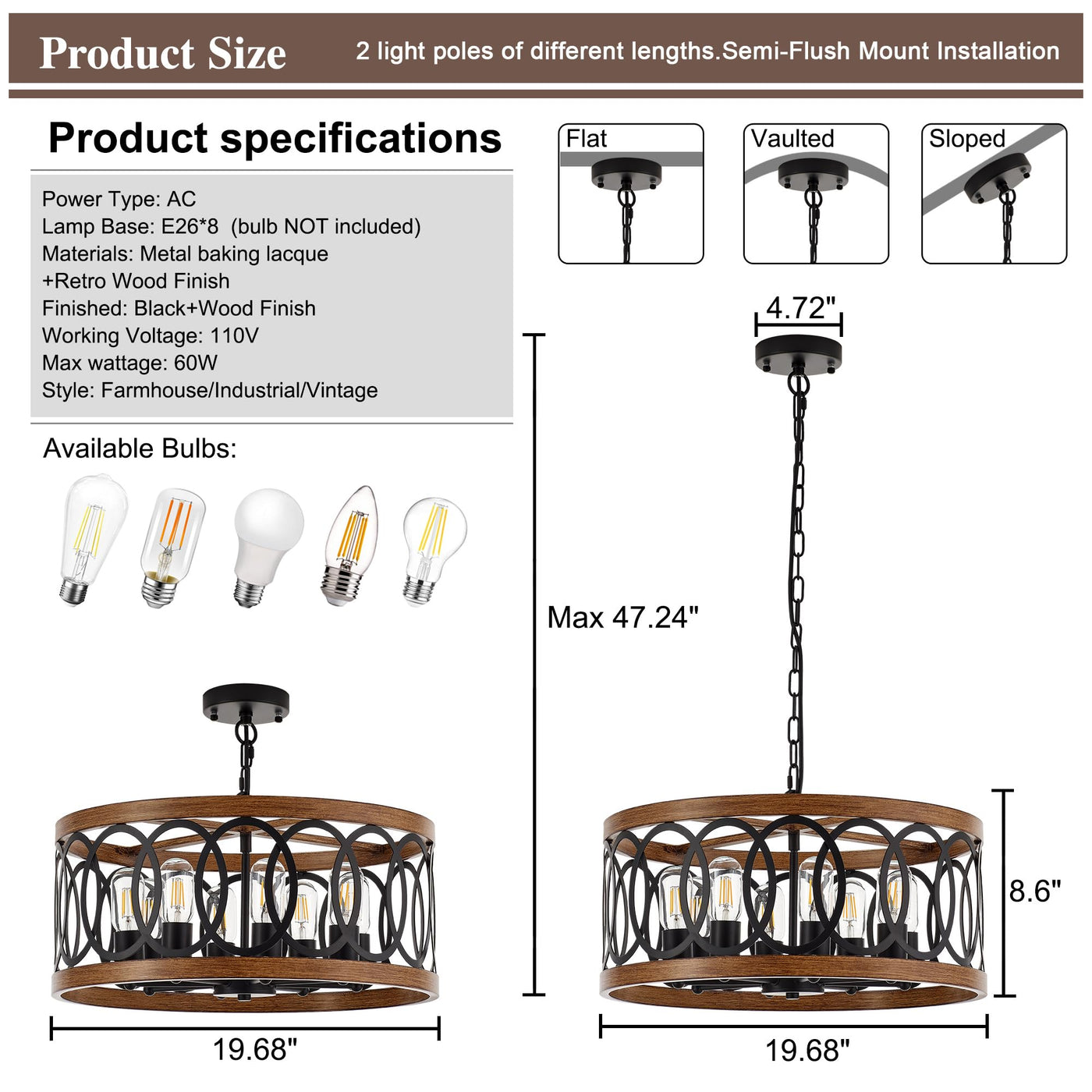 Q: What type of bulbs does the Faibra 8-Light Farmhouse Drum Pendant Light require?A: The Faibra 8-Light Farmhouse Drum Pendant Light is designed with a standard E26 bulb holder and requires 8 E26 base bulbs, with a maximum wattage of 60W per bulb.