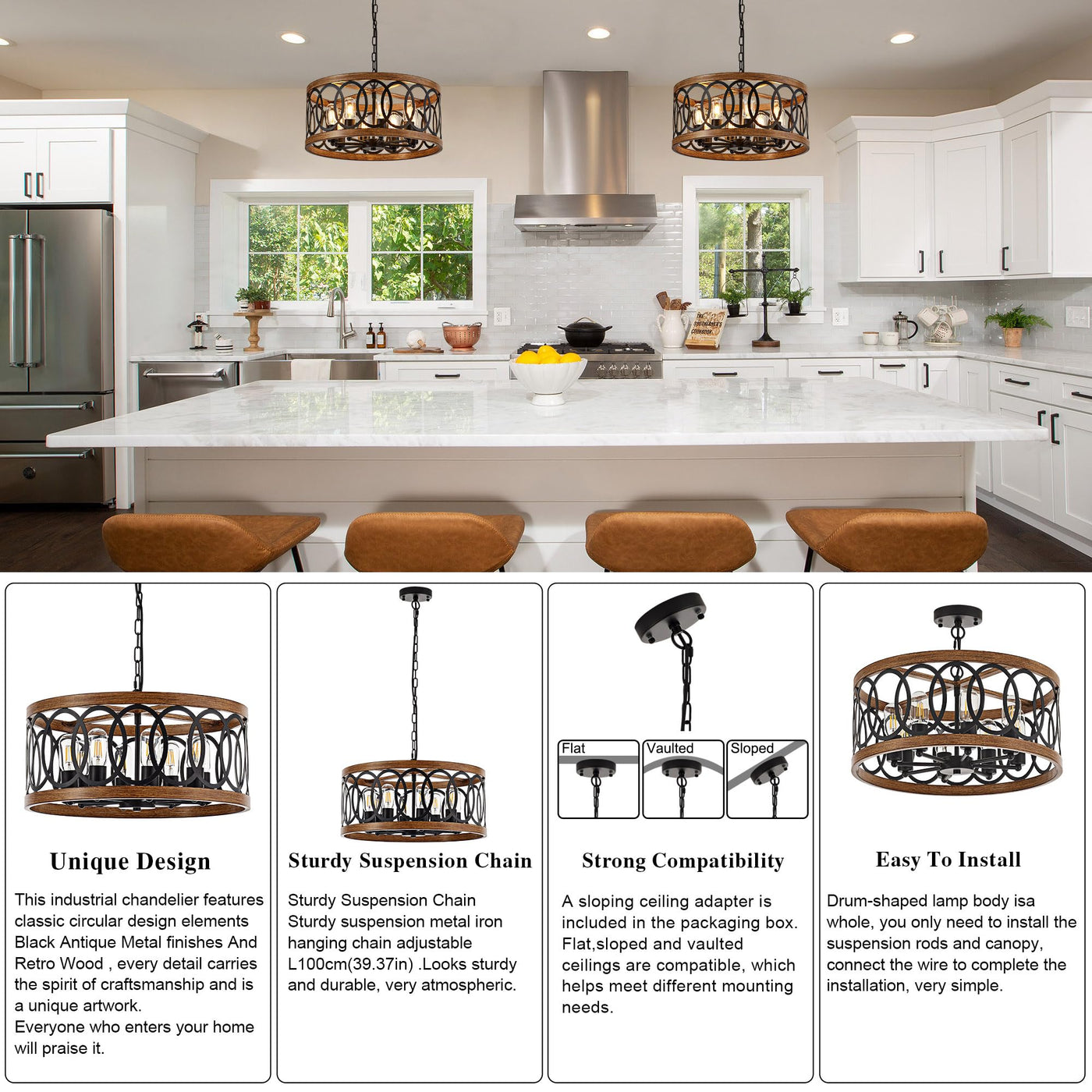 Faibra 8-Light Farmhouse Drum Pendant Light,19.68'' Nature Wood Texture Vintage Rustic Chandeliers Black Metal Industrial Hanging Light Fixtures For Entryway, Bedroom Dining Room