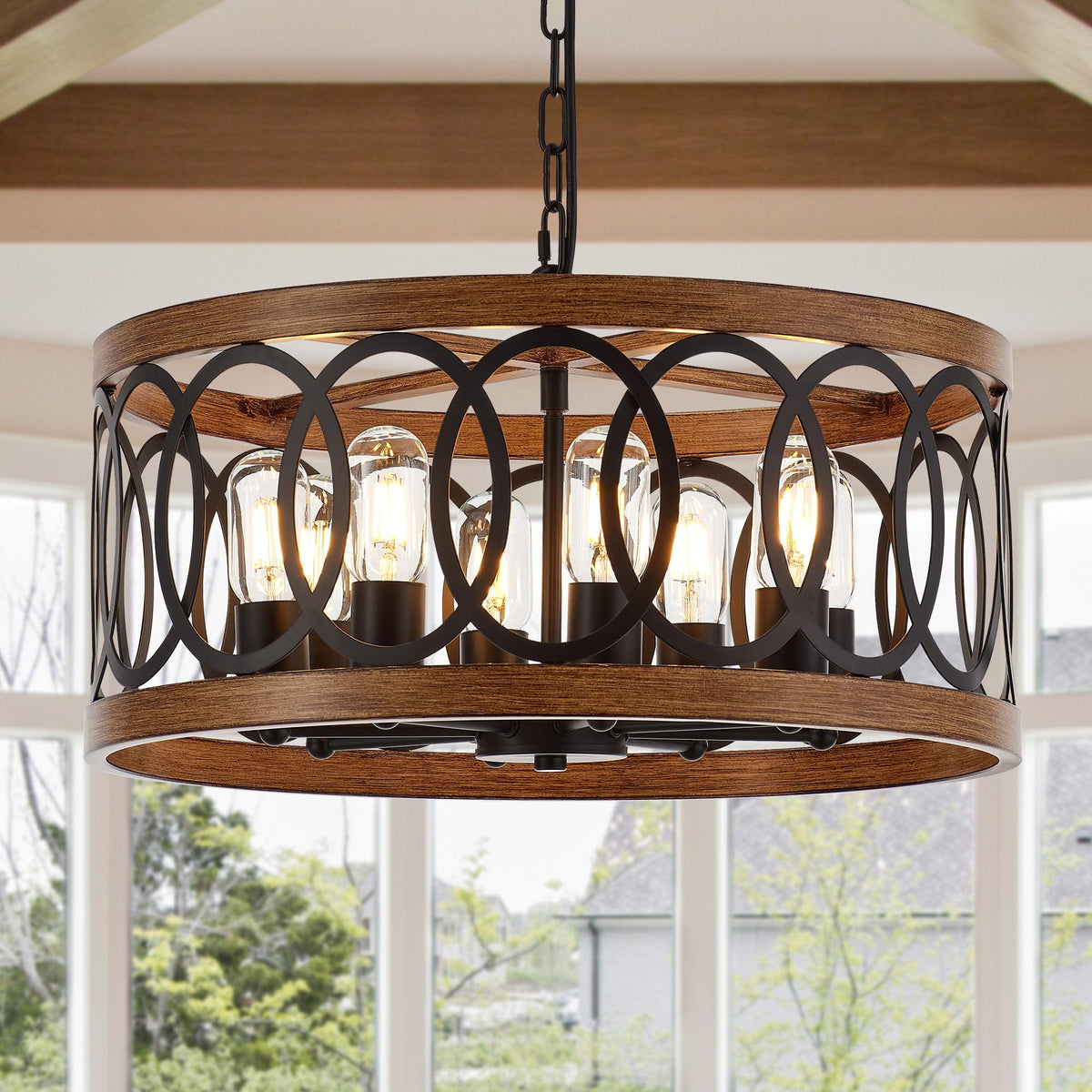 Faibra 8-Light Farmhouse Drum Pendant Light,19.68'' Nature Wood Texture Vintage Rustic Chandeliers Black Metal Industrial Hangin