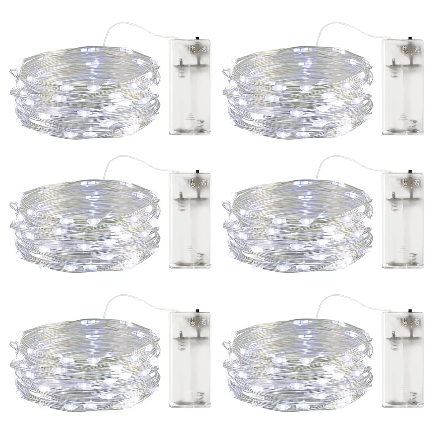 ?Specification? Pack of 6 or 8: 6 or 8 packs fairy light 2m/6.6 ft for each 20 LEDs for each. The LEDs are placed regularly, about 10cm/3.94in apart he lead is about 30cm/11.8in IP44 Waterproof (battery box is not water resistant) Powered by 3 AA battery (not included)