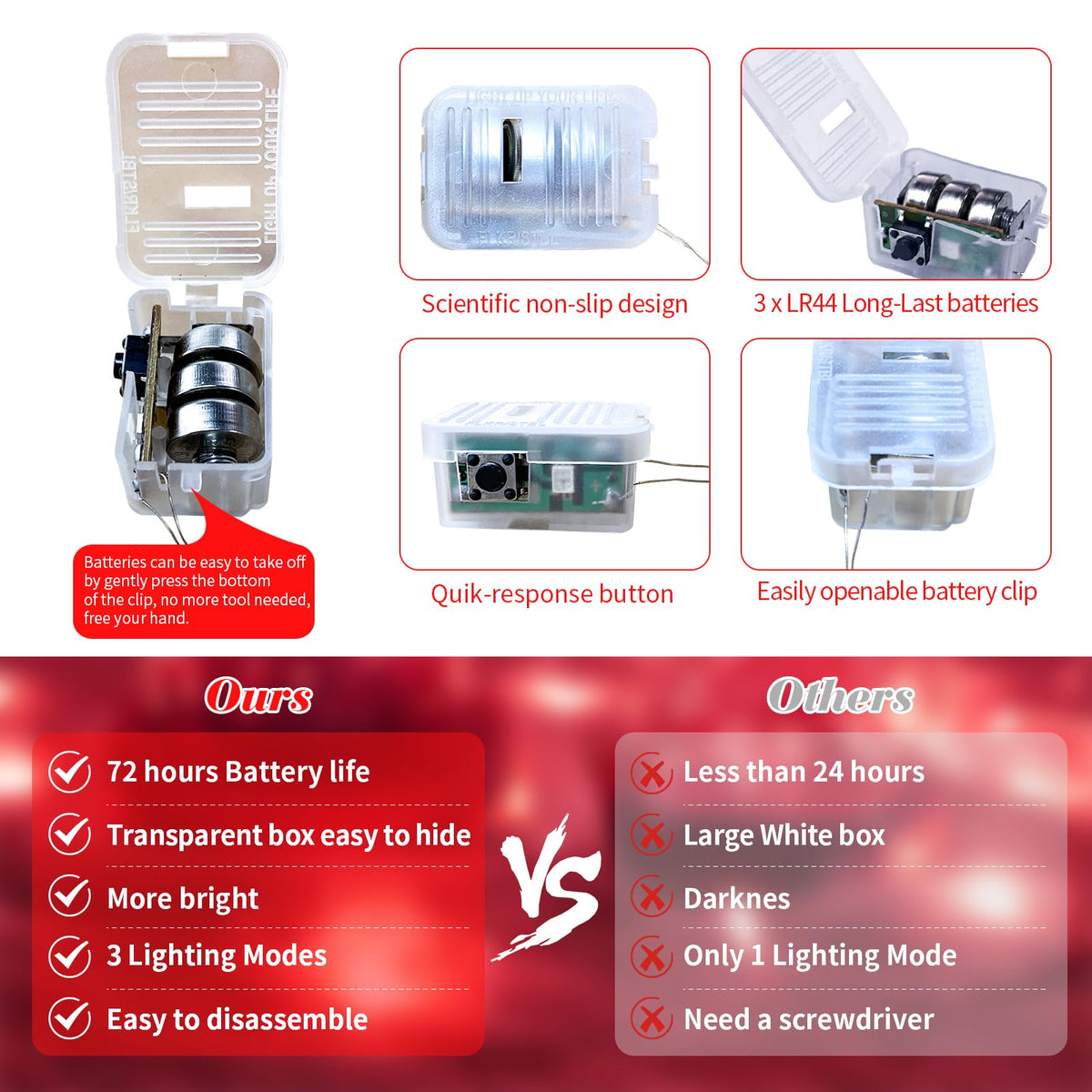 Q: How can I easily replace the batteries in the fairy lights?A: The upgraded battery pack design allows for easy battery replacement. You simply need to gently press the bottom of the clip to open the battery compartment, eliminating the need for a screwdriver.