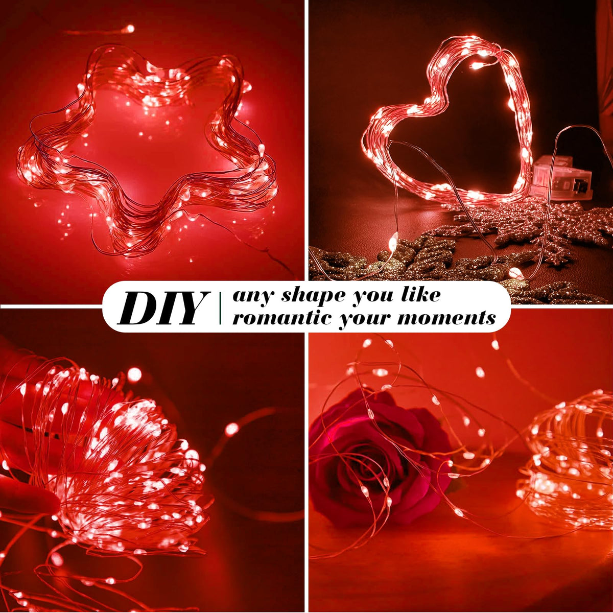 Q: What materials are the fairy lights made of?A: The fairy lights are made of high-quality, durable plastic and feature a flexible silver wire. This allows you to bend and shape the lights to fit your decorative needs, whether it's wrapping around objects or creating unique displays.