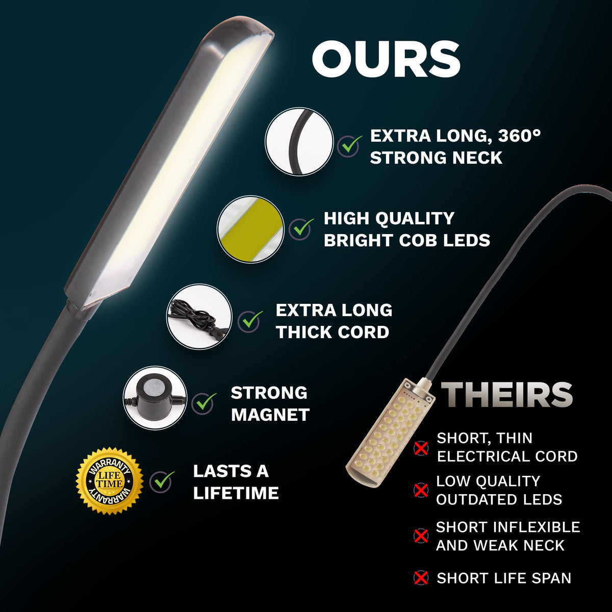 360° Flexibility: Features a 12-inch adjustable gooseneck that allows for easy positioning without sagging or drooping, perfect for various tasks including sewing and machining.