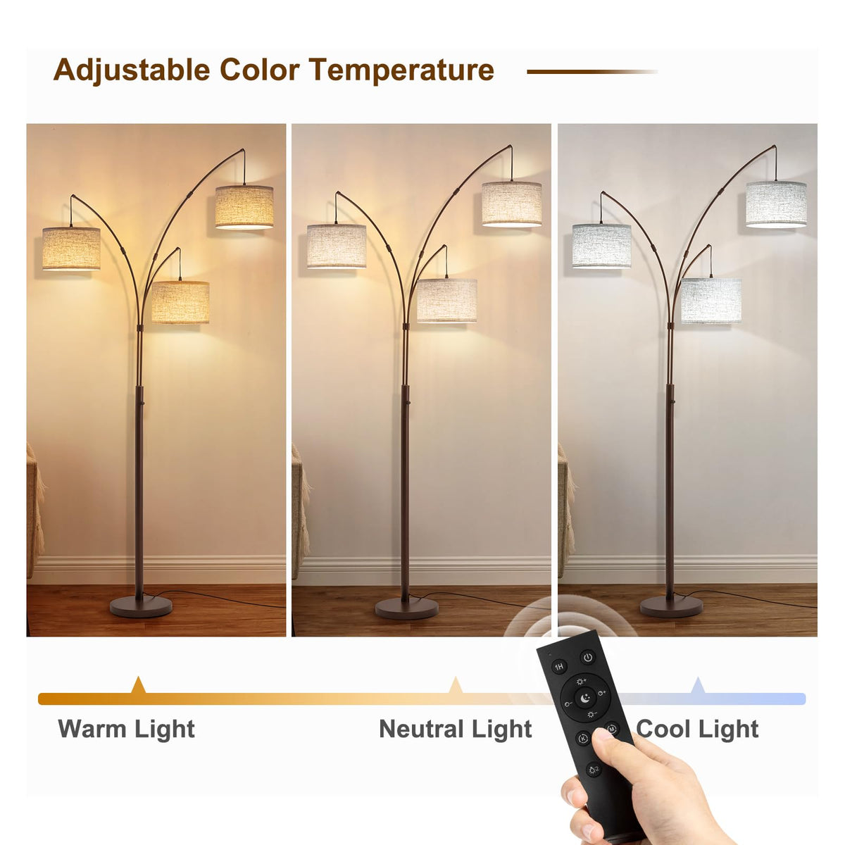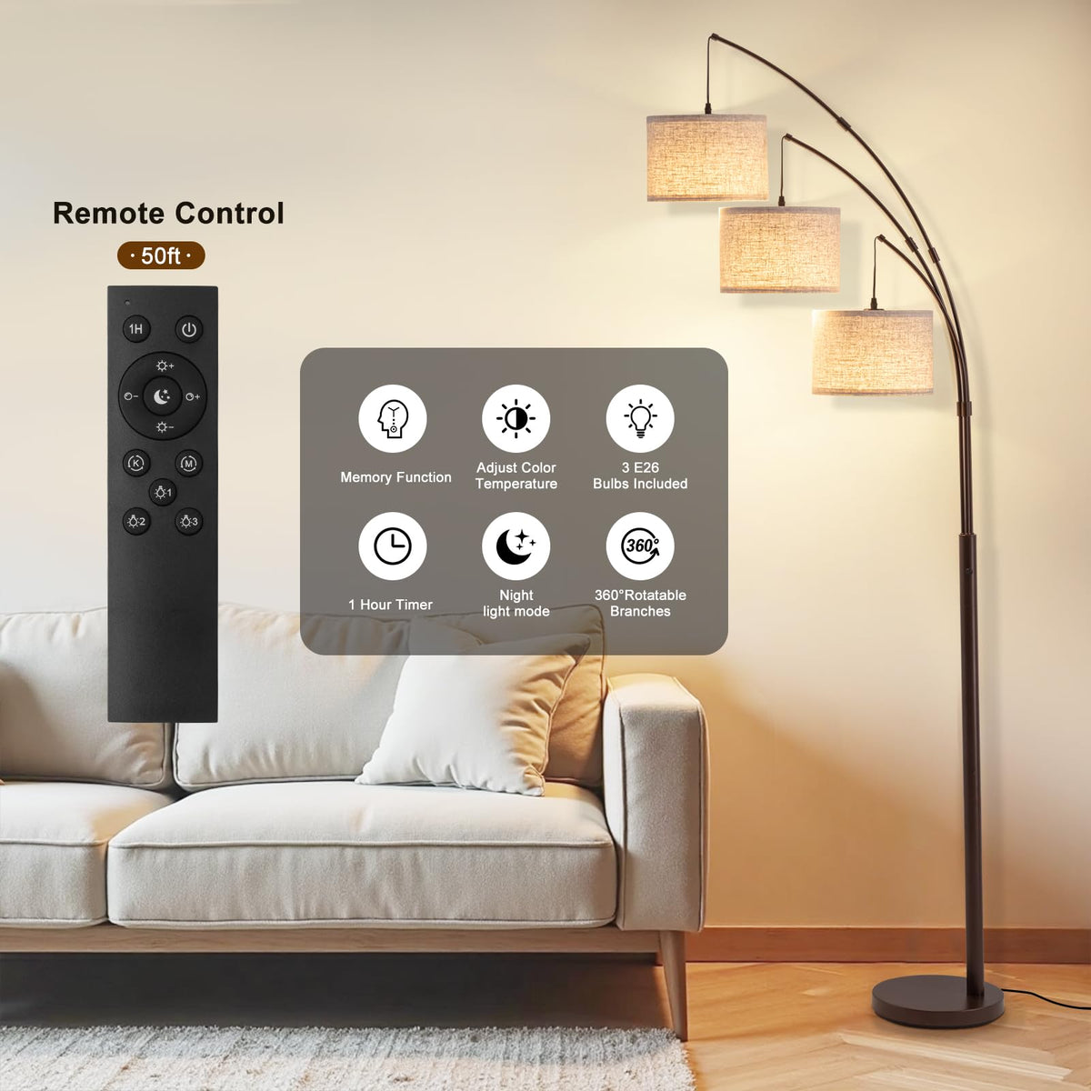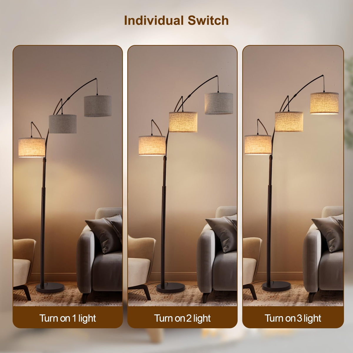 Transform your space with the understated elegance of this contemporary multi-light arc floor lamp. Featuring a sleek, tall profile, this lamp's modern design effortlessly complements various home d cors. Its slim, arching frame gracefully extends into three gently curved arms, each topped with a simple yet sophisticated linen shade in a neutral taupe hue. Equipped with three LED bulbs and a user-friendly rotary switch, this floor lamp allows you to customize the color temperature to your preference, offering soft, eye-friendly lighting that's perfect for creating a cozy ambiance. Ideal for illuminating any room, this standing lamp provides both function and style, making it a perfect addition to your living room or reading nook. The matte black metal base adds a contemporary touch, making this 3 light floor lamp a striking accent piece above your sofa or favorite armchair.