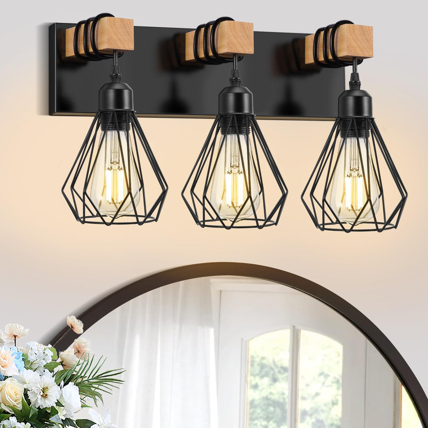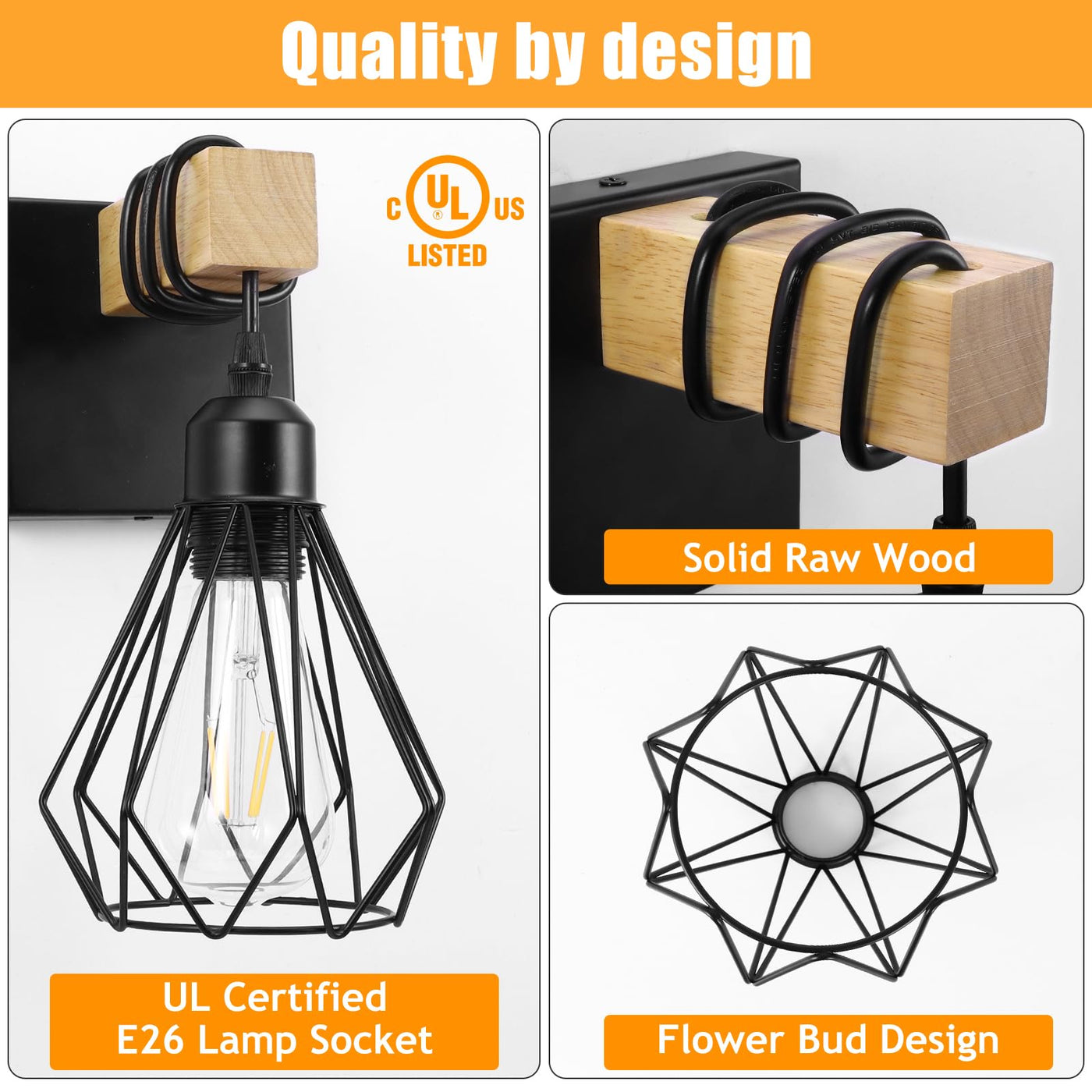 This farmhouse bathroom vanity light fixture features a solid wood finish paired with a black, bud - shaped metal cage. It comes with an E26 lamp holder, which is compatible with all E26 - model bulbs. It's not only suitable for bathroom lighting above the mirror but also for other areas in the room, such as living rooms, vanities, medicine cabinets, art displays, bedrooms, hallways, porches, stairways, and any other places that need an aesthetic upgrade and proper lighting.