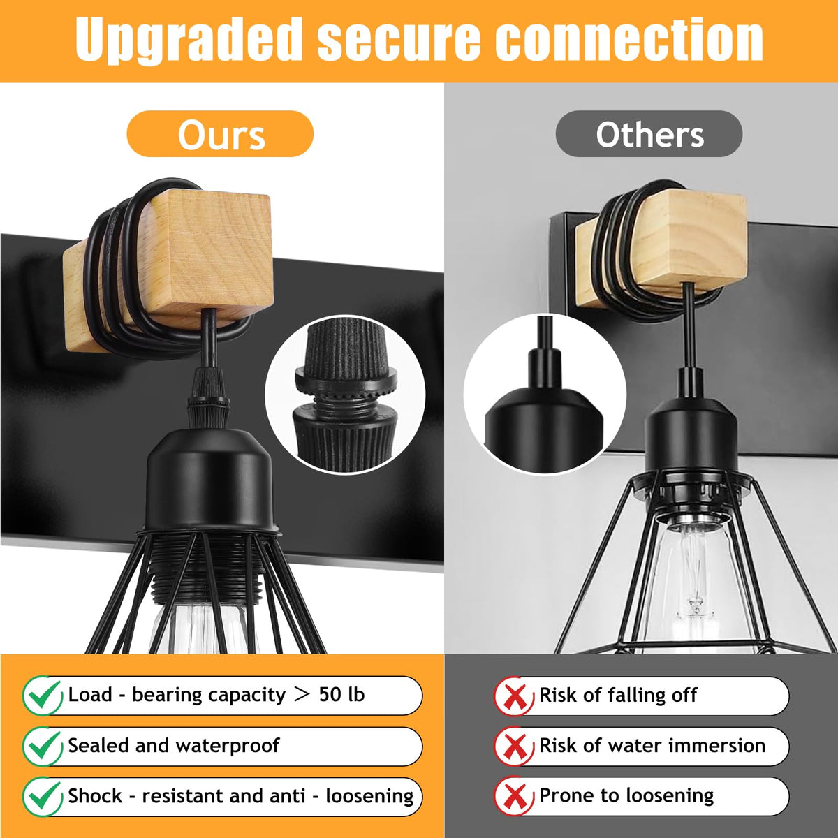 This farmhouse bathroom vanity light fixture features a solid wood finish paired with a black, bud - shaped metal cage. It comes with an E26 lamp holder, which is compatible with all E26 - model bulbs. It's not only suitable for bathroom lighting above the mirror but also for other areas in the room, such as living rooms, vanities, medicine cabinets, art displays, bedrooms, hallways, porches, stairways, and any other places that need an aesthetic upgrade and proper lighting.