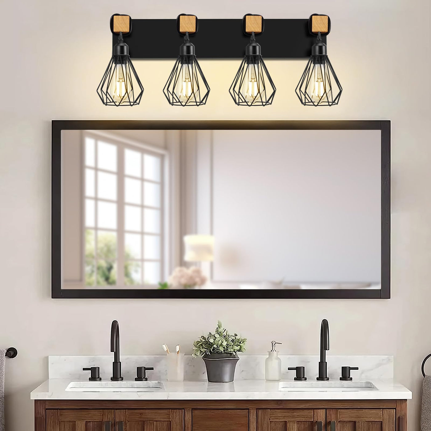 Farmhouse Bathroom Vanity Light Fixtures, 4-Light Wood Bathroom Light Fixtures Over Mirror, Black Rustic Sconces Wall Lighting W