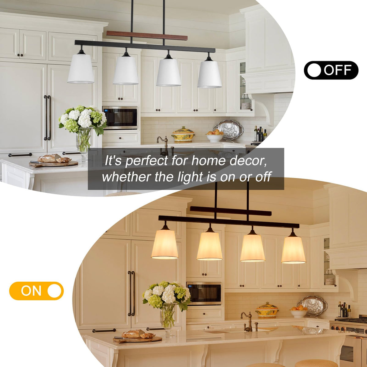 Farmhouse Dining Room Light Fixture Over Table, 4-Light Kitchen Island Lighting, Rustic Wood Linear Chandeliers With White Fabric Shade, Matte Black Hanging Pendant Light Fixtures