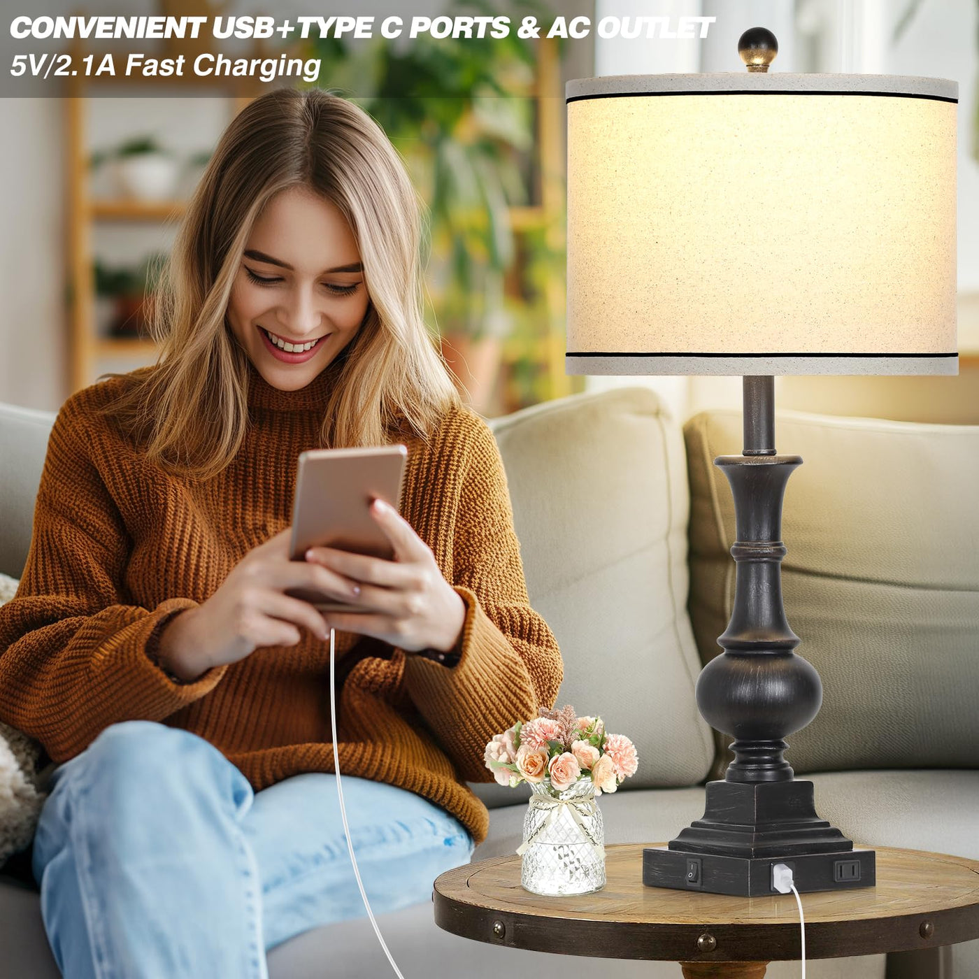 Farmhouse Lamps Set Of 2, Antique Vintage Rustic Touch Control Table Lamps With Usb A+C Ports & Ac Outlet, Retro Classic Bedside