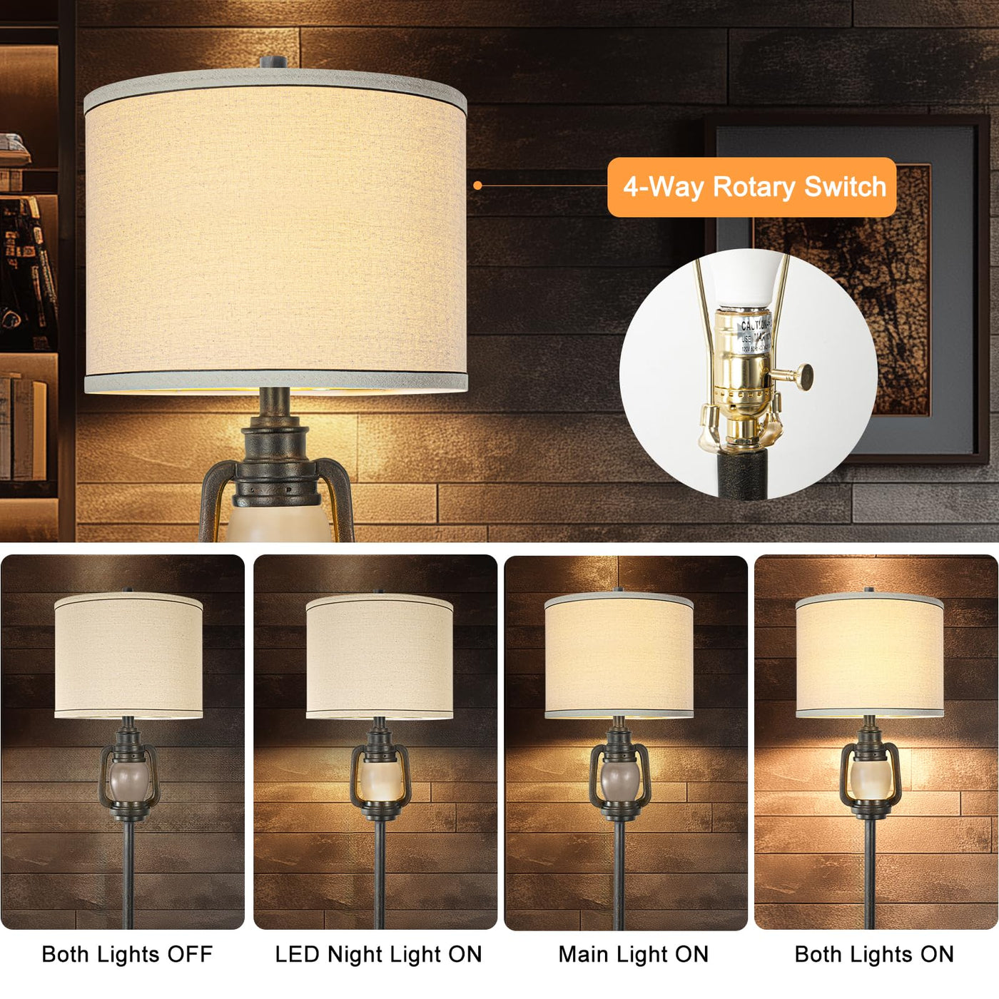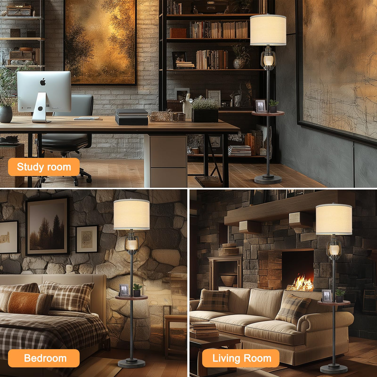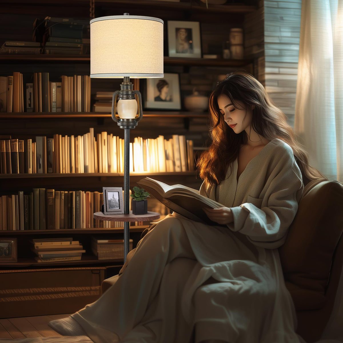 Farmhouse Lantern Floor Lamp With Tray For Living Room With Nightlight Vintage Tall Lamp With Linen Fabric Shade Industrial Stan