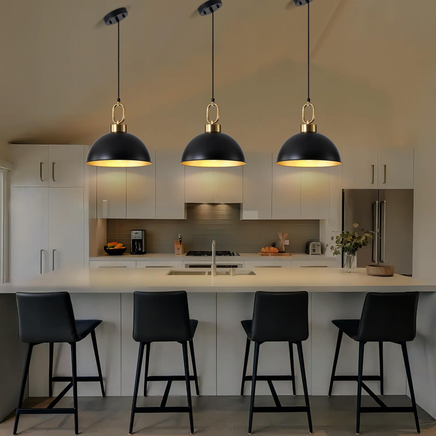Q: What design style does this pendant light complement?A: The Farmhouse Pendant Light Fixture features an industrial modern design with a classic dome silhouette and a gold top, making it an elegant addition to various decor styles, including vintage and contemporary settings.