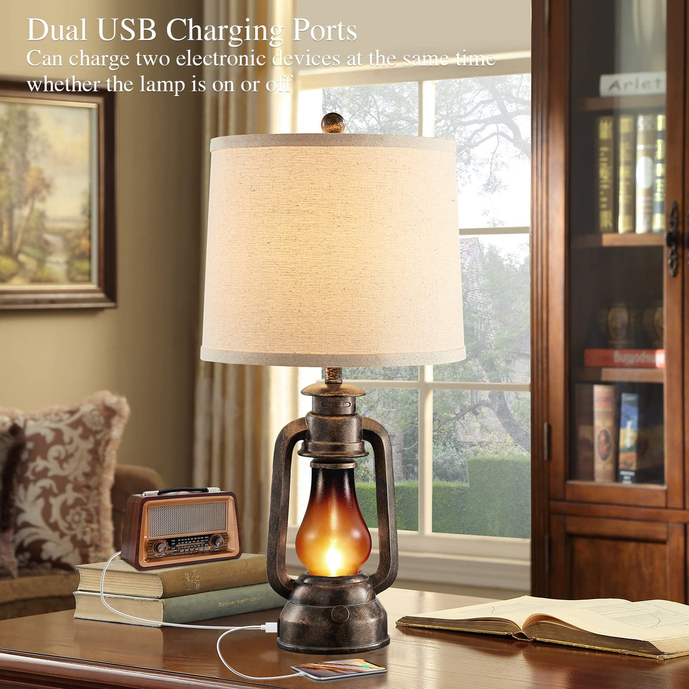Farmhouse Rustic Table Lamps For Bedroom Set Of 2, Vintage Lantern Lamp With Dual Usb Charging Ports,25'' Retro Antique Bedside