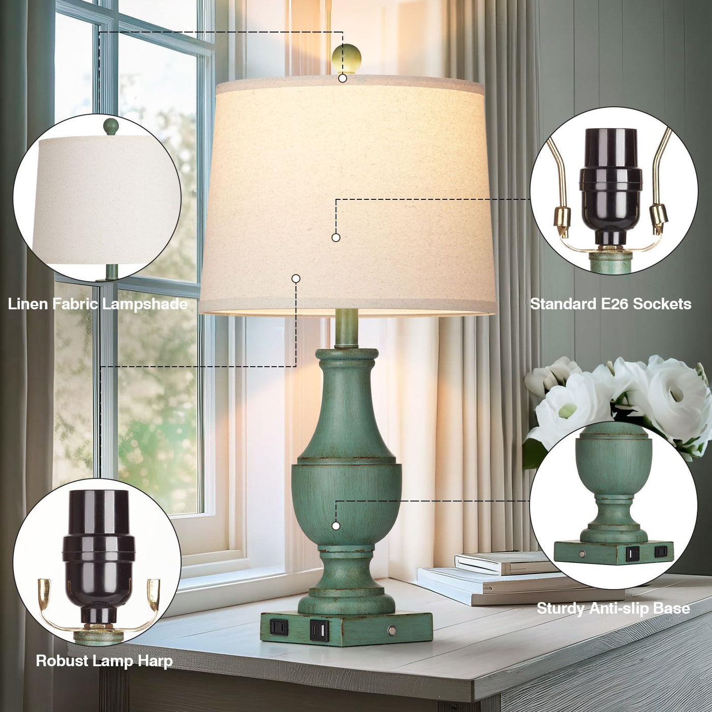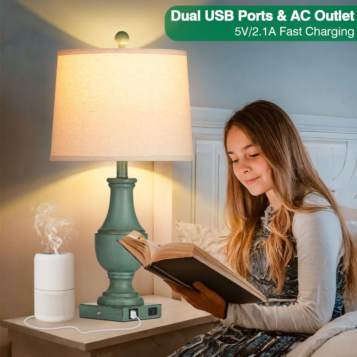 Q: What are the charging options available with these farmhouse table lamps?A: The farmhouse table lamps come equipped with two USB ports (USB A and Type-C) and an AC outlet. This allows you to charge multiple devices such as smartphones, tablets, and other electronics conveniently, whether the lamps are on or off.