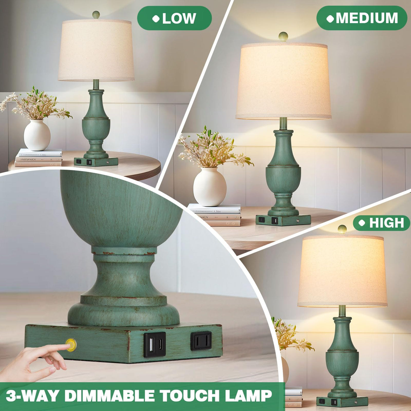 Q: How does the 3-way dimmable touch control feature work?A: The lamps feature a sensitive touch control that allows you to adjust the brightness with a gentle tap on the base. You can choose from three levels of brightness—low, medium, and high—making it easy to create the perfect ambiance for sleeping, reading, or working.
