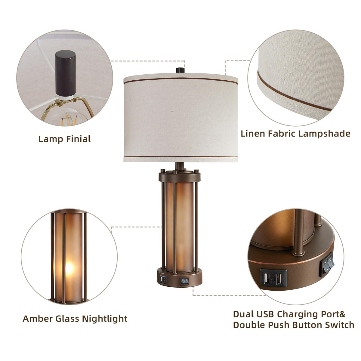 Farmhouse table lamp made of oil rubbed brown metal, amber glass night light and linen fabric shade. The brown metal stand blends perfectly with the amber glass night light to give a classic and elegant texture, creating a warm and cosy home atmosphere. Ideal for bedrooms, living rooms, dens and entryways. Matches perfectly with farmhouse, vintage, country, traditional and other home styles. Multiple Advanced Features Our living room table lamp comes with a night light and dual USB charging ports, combining practicality and aesthetics. High quality materials and stable construction Our table lamp comes with a high quality heavy duty metal base. The base is equipped with advanced non-slip pads, making the table lamp super stable and safe to use. Vintage and elegant design, perfect decoration This table lamp incorporates vintage elements, the bronze metal stand wrapped with amber glass shade makes the table lamp more stylish yet design, and also effectively protects the light at night. Easy Installation All accessories are included in the package for you to assemble. Follow the instructions and you will get a stunning table lamp in minutes, saving a lot of time and energy.