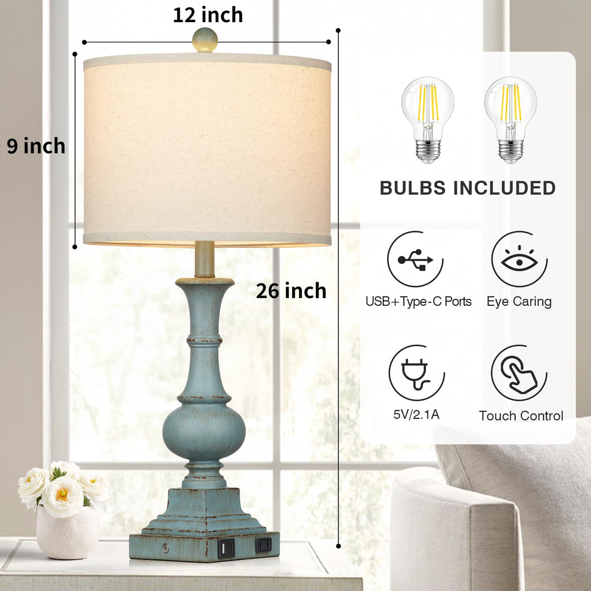 Farmhouse Table Lamps Set Of 2, 26'' Vintage Rustic Touch Control 3-Way Dimmable Bedside Lamp With Usb A+C Ports & Ac Outlet, Bl