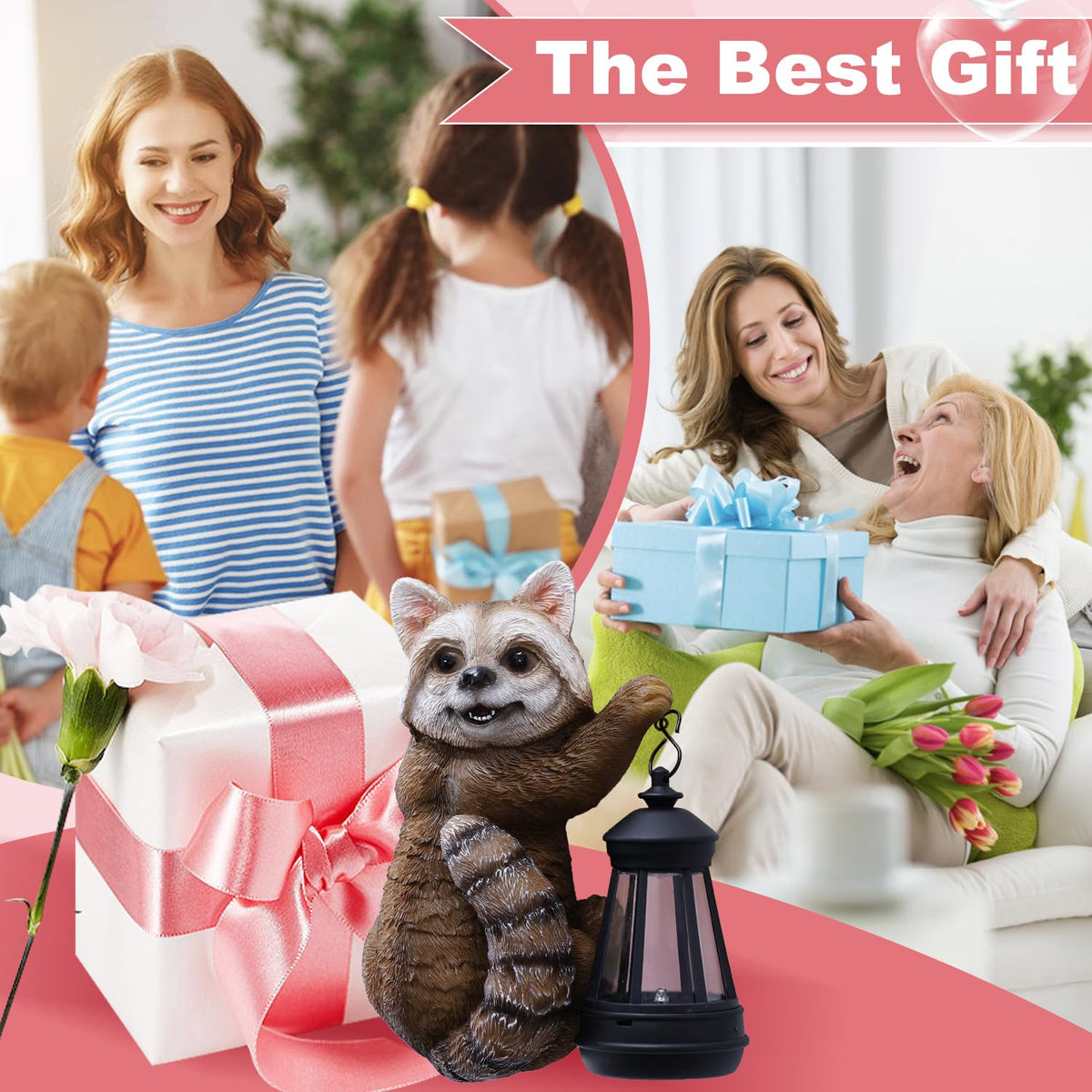 Q: What makes this raccoon statue a good gift choice?A: This beautifully crafted raccoon statue with solar lantern is a perfect gift for garden enthusiasts, especially for occasions like Mother's Day, due to its unique design and functional solar lighting.