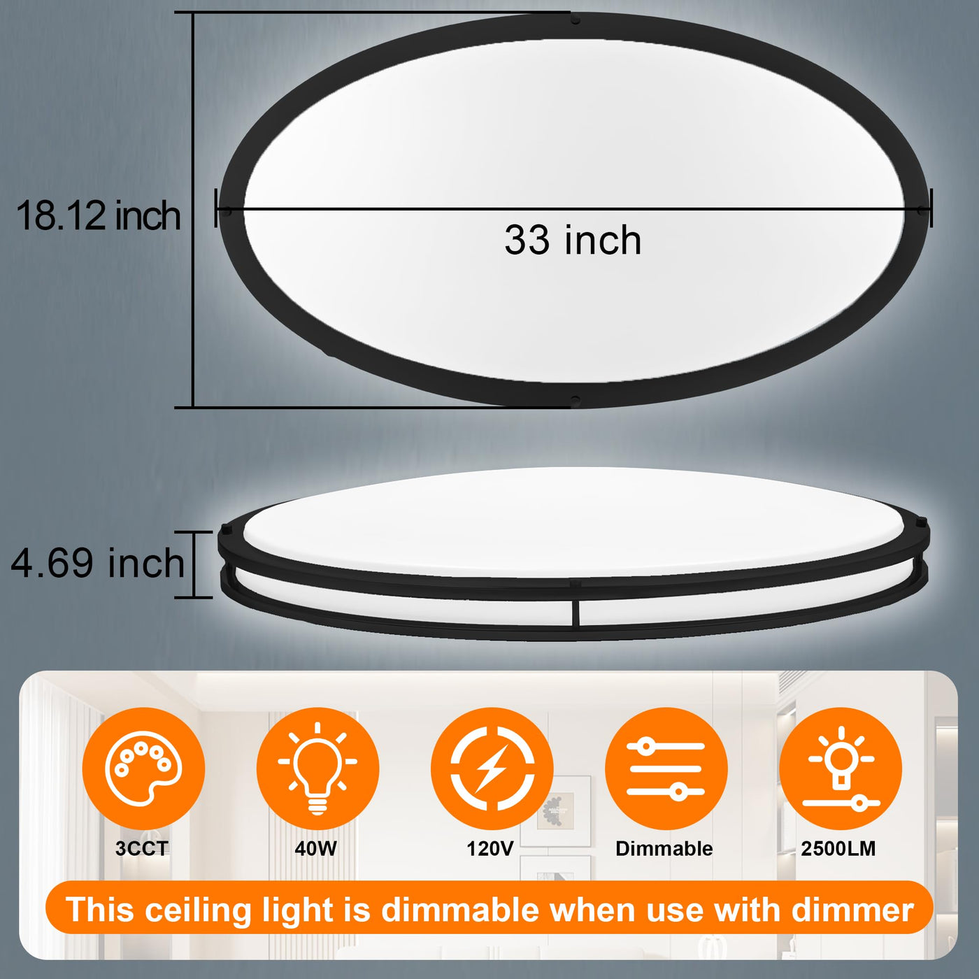 This black flush ceiling light fixture is constructed from well-made matte black steel and polystyrene, ensuring durability and a modern aesthetic. The sleek oval design measures 33 inches in width and 18.12 inches in length, making it suitable for larger areas while still being compact enough for smaller rooms. With three adjustable color temperature settings (3000K, 4000K, and 5000K), this fixture allows you to customize the ambiance according to your needs. The internal switch enables easy adjustments before installation, ensuring the perfect lighting mood for any occasion.