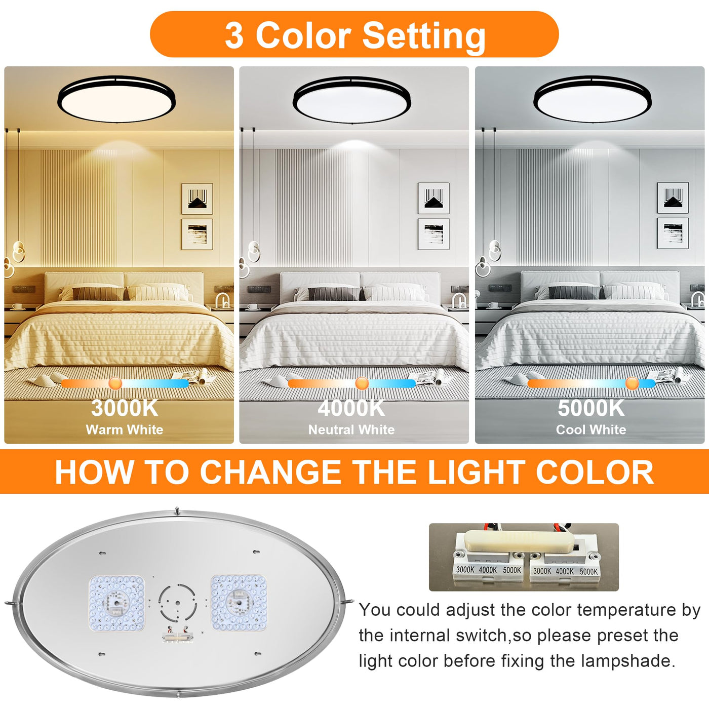 Q: What are the color temperature options available for this ceiling light?A: This ceiling light offers three adjustable color temperature options: three thousand Kelvin, four thousand Kelvin, and five thousand Kelvin, allowing you to customize the lighting ambiance.