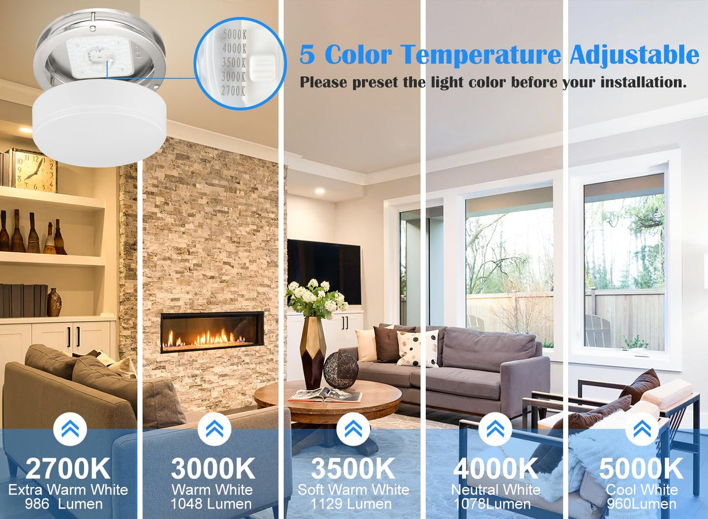 Q: What are the color temperature options for the Faymart Brushed Nickel Flush Mount LED Ceiling Light?A: The Faymart Brushed Nickel Flush Mount LED Ceiling Light offers five color temperature options: 2700K, 3000K, 3500K, 4000K, and 5000K. This allows you to choose the perfect lighting for any mood or setting in your home.