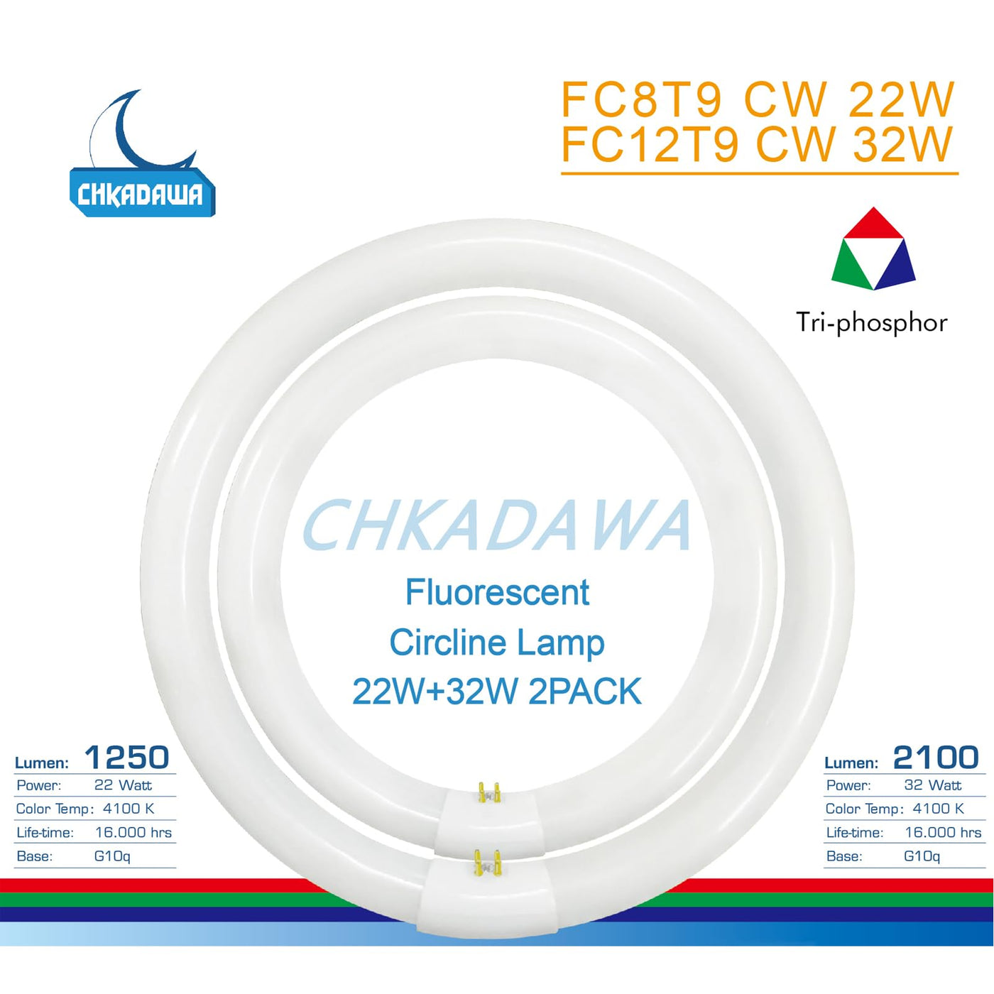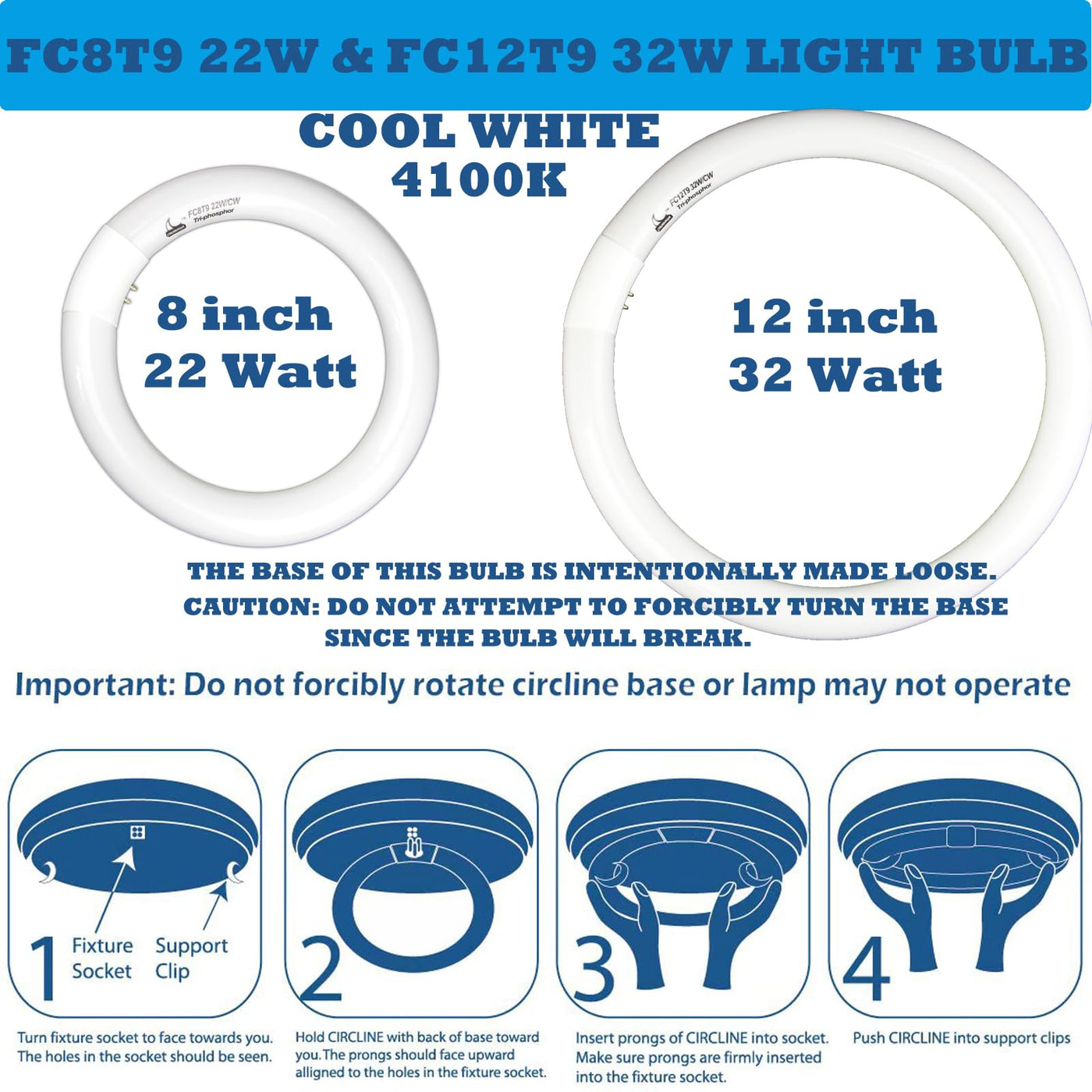 The CHKADAWA FC8T9 22W CW & FC12T9 CW T9 32W Circular Fluorescent light bulb adopt circline fluorescent lamp technology, G10q 4 Pin standard base, giving you a bright light. Average 12,000 hours lifespan working with reliable electronic or magnetic ballast. Easy to replace old round fluorescent tubes in ceiling light fixtures. T9 bulbs is energy saving, fits all conventional fixtures. G10q caps, the base of this lamp is intentionally made loose. How to choose T9 circular bulbs: wattage, T9 bulb size or dimensions, 4 pin G10q socket or base. Application: circular fluorescent bulb ceiling lights in living room, bedroom, kitchen, laundry room, bathroom, sewing room, hallway, office, garage, basement. Caution: do not attempt to forcibly turn the base since the lamp will break.