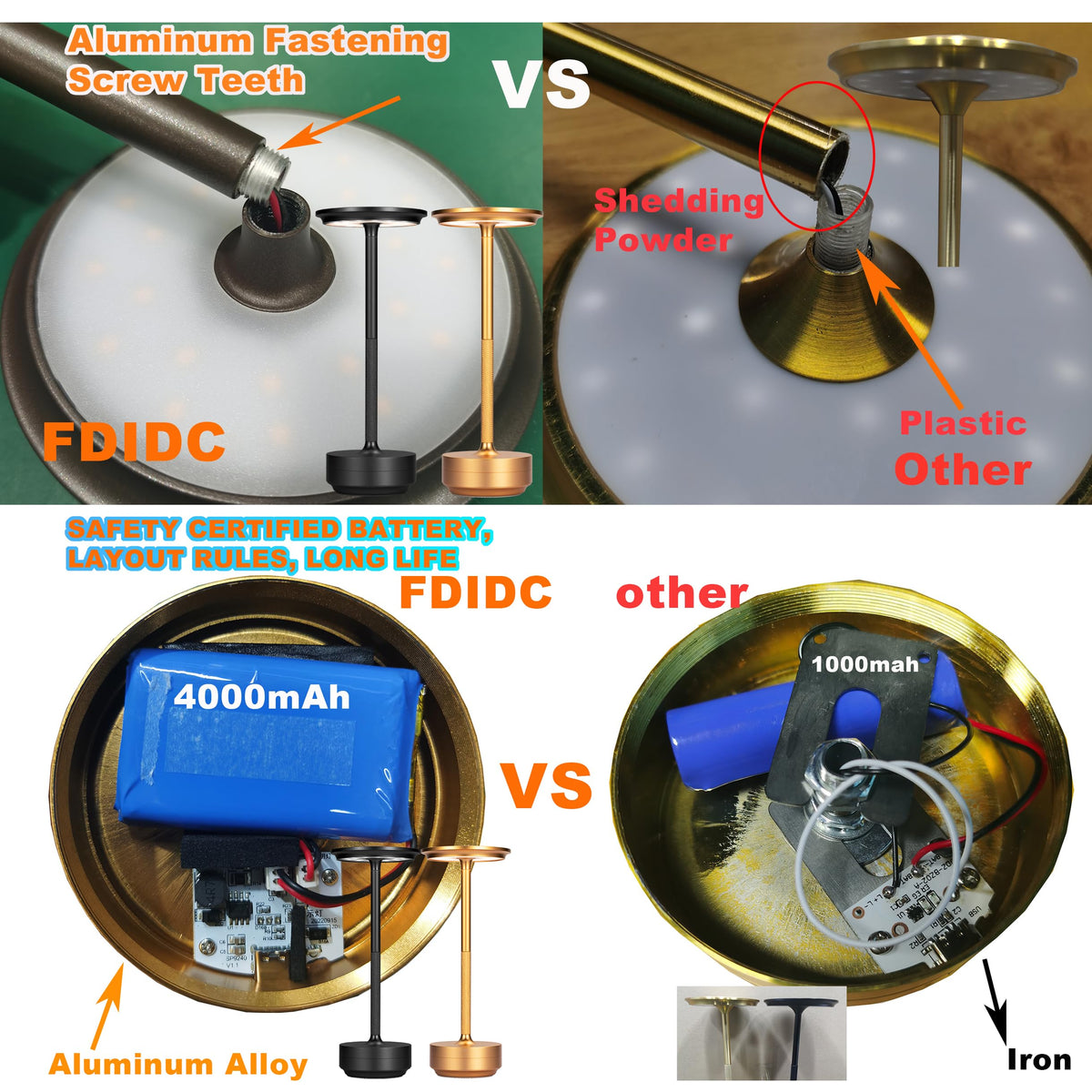 Q: What are the dimensions of the FDIDC Cordless Table Lamp?A: The FDIDC Cordless Table Lamp has a compact design with dimensions of 4.69 inches in length and 4.69 inches in width, making it suitable for various spaces.