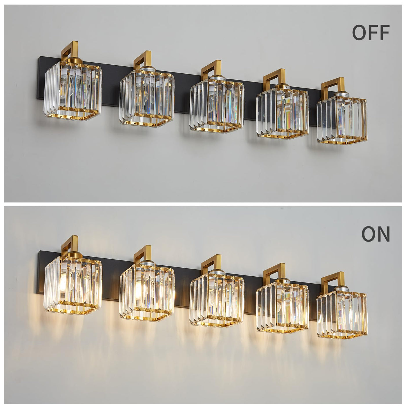 Fdpby Modern Bathroom Vanity Light 5-Lights Black Gold Crystal Wall Lamp Bathroom Modern Crystal Vanity Lighting