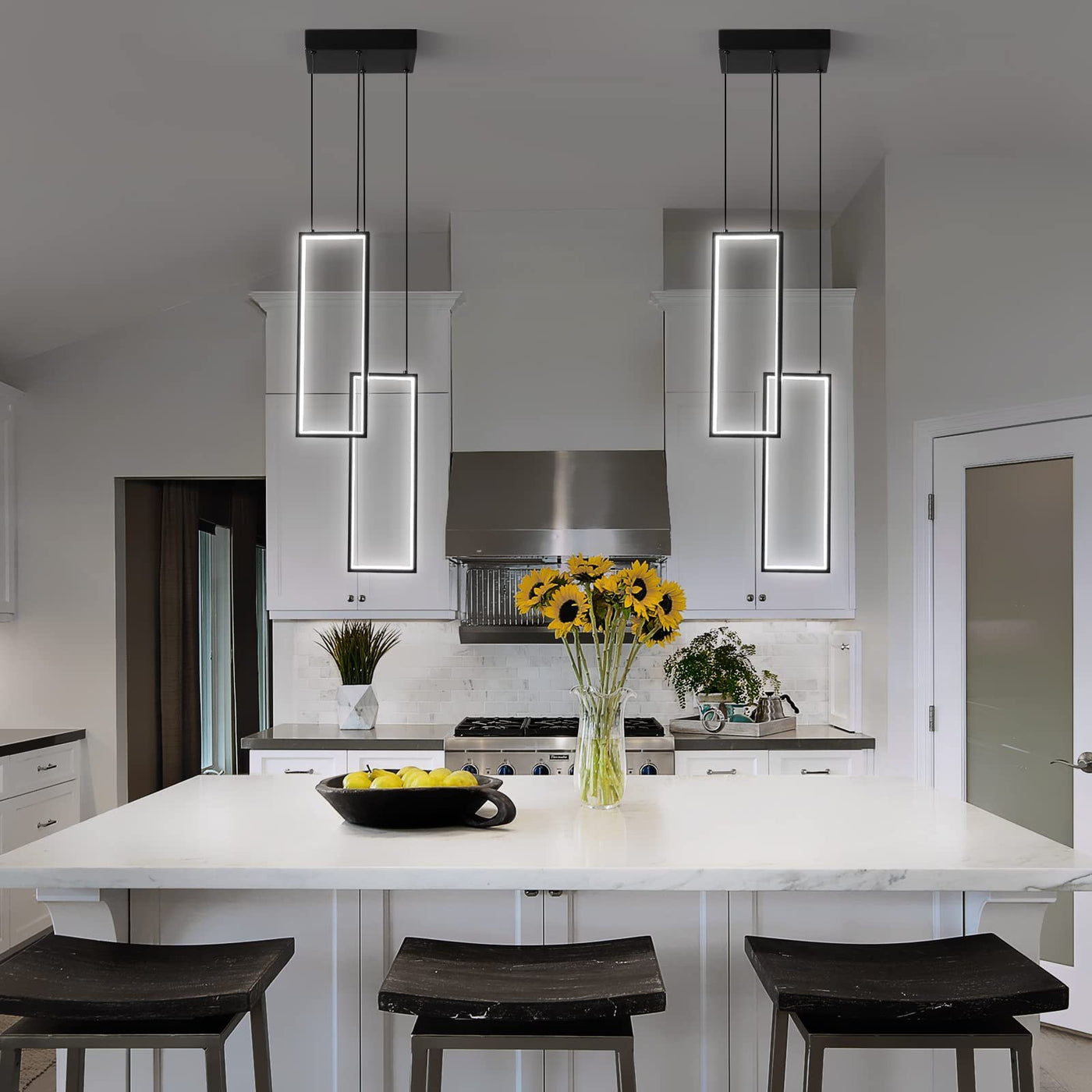 Modern Kitchen Pendant Light Fixture Black 18W LED Pendant Light 2 Rings Rectangle Chandelier Pendant Lighting for Kitchen Island Living Room Dining Room Bedroom