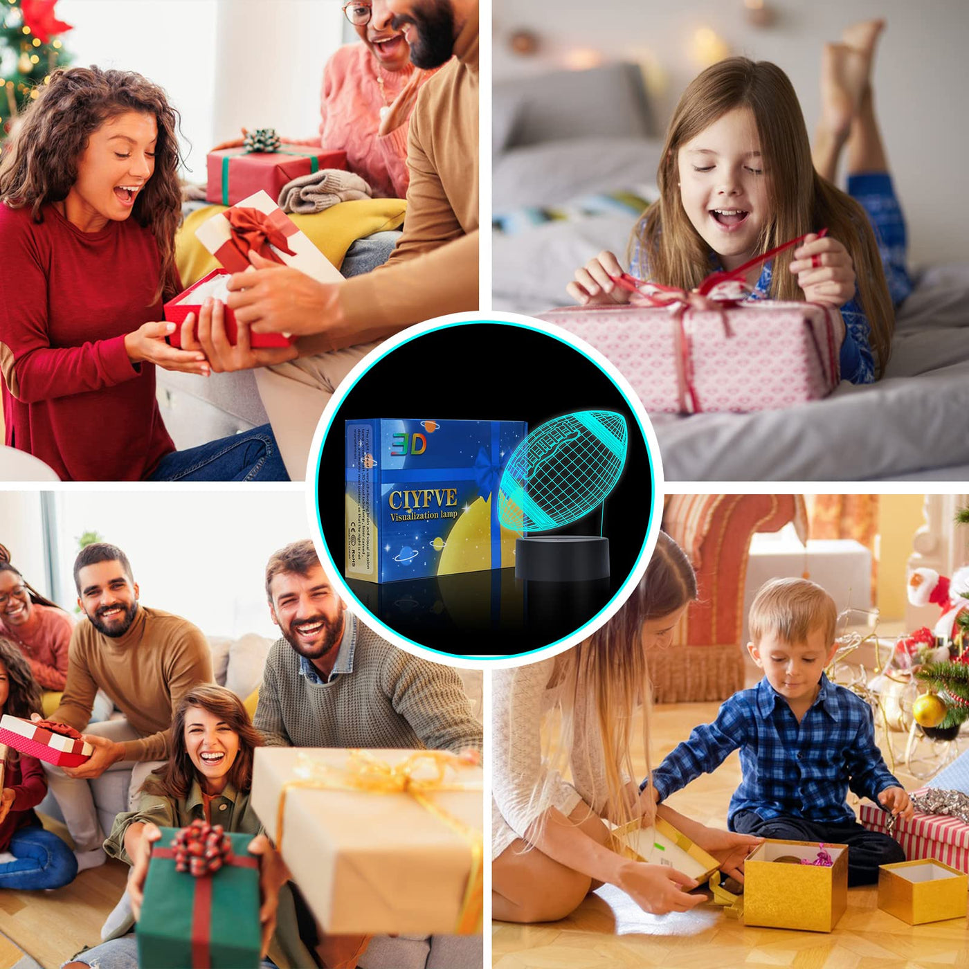 Q: What are the main features of the FEBDEY Football Night Light?A: The FEBDEY Football Night Light features a 3D visual effect created using advanced technology, providing a stunning optical illusion. It is a dimmable LED nightlight with a smart touch dimmer that offers 7 color changing options: Red, Green, Blue, Yellow, Cyan, Pink, and White. This lamp is perfect for kids' rooms, and serves as an excellent gift for various occasions.
