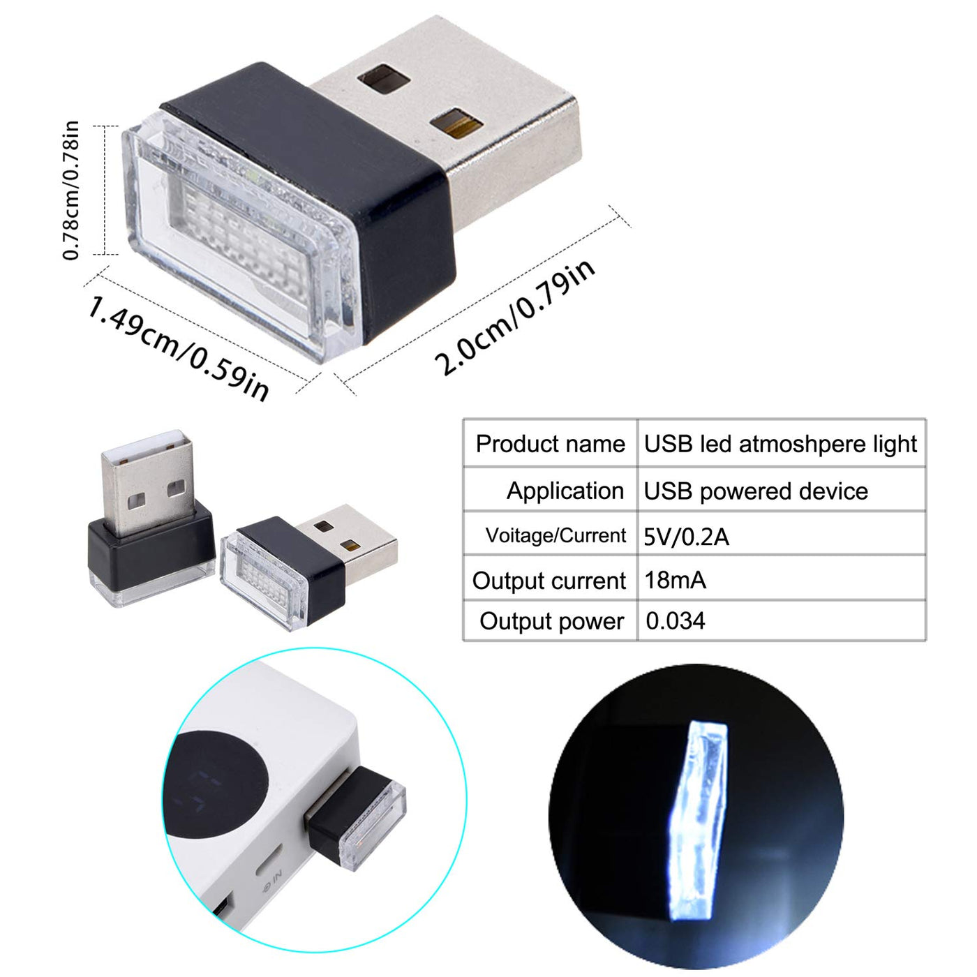 About this product: Increase the atmosphere for play or work. Easy to control and pick things. Low energy consumption and long service life. Can be used as a night light to find items. Plug and play - as long as it is a USB interface. The USB car atmosphere light is made of high-quality led lights, durable and environmentally friendly. The Car Night Decoration Light can fit all cars with USB ports,no additional connect device.