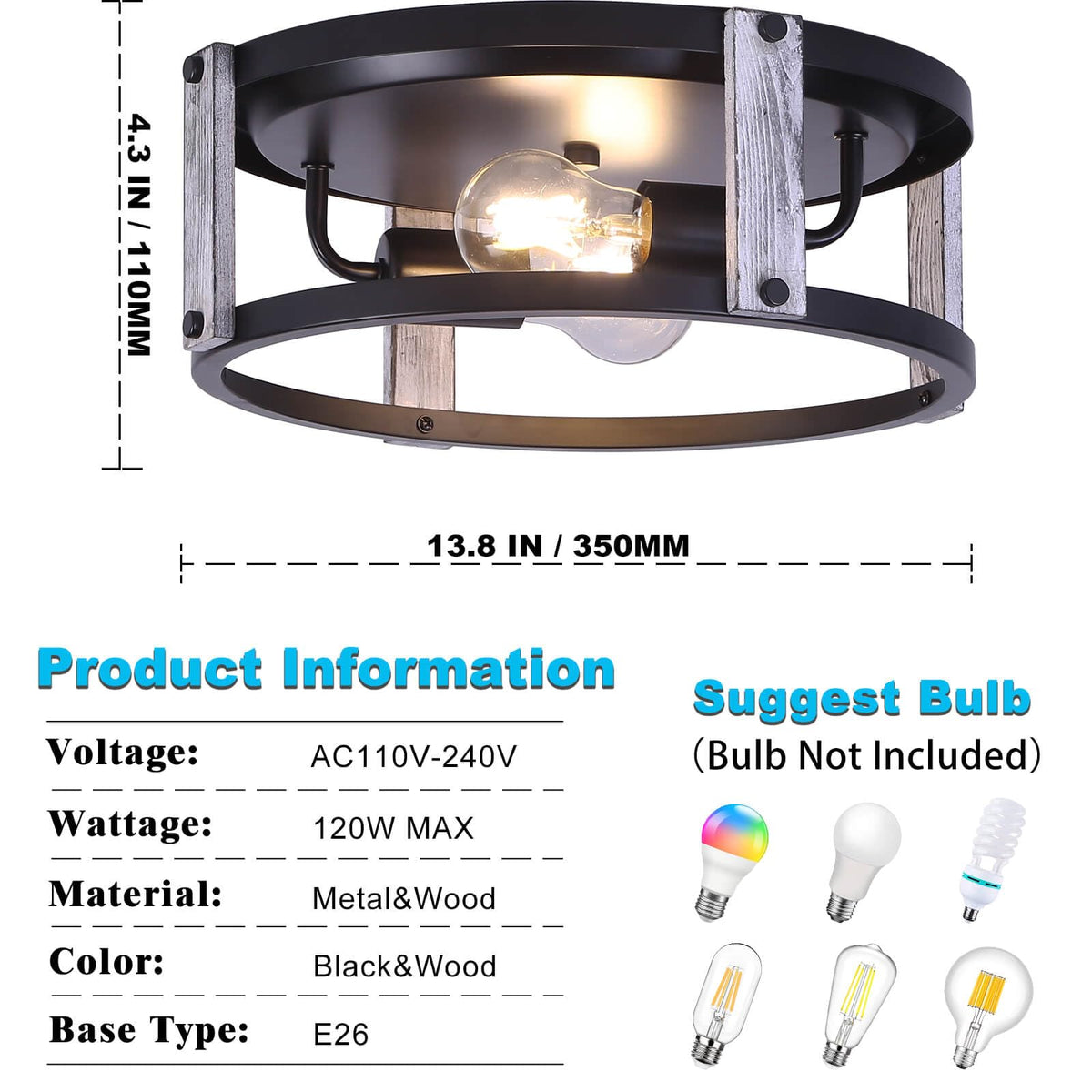 Features Name:2 Pack Ceiling Light Fixtures Brand:FEHEED(A factory devoted to providing customers with beautiful light ) Style:Semi Flush Mount/Farmhouse/Rustic/Retro... Voltage:110-130V Material: High-quality Metal Lamp Base:Use 4 E26 Bulbs(60W max,not included) Product Weight:3.1pounds(single product) Product Size: 12.6'' X 12.6'' X 4.33''(single product) Package Include Ceiling Light Fixture x2 User Manual x1 Who is Adeekar? ??Professional We are a lighting manufacturing factory established in 2010, specializing in the production and design of ceiling lamps, pendant lamps, table lamps, etc. to provide better lighting for our customers. ??Services The products will be fully tested before leaving the factory, you can contact us if you have any problems in the purchase or use.