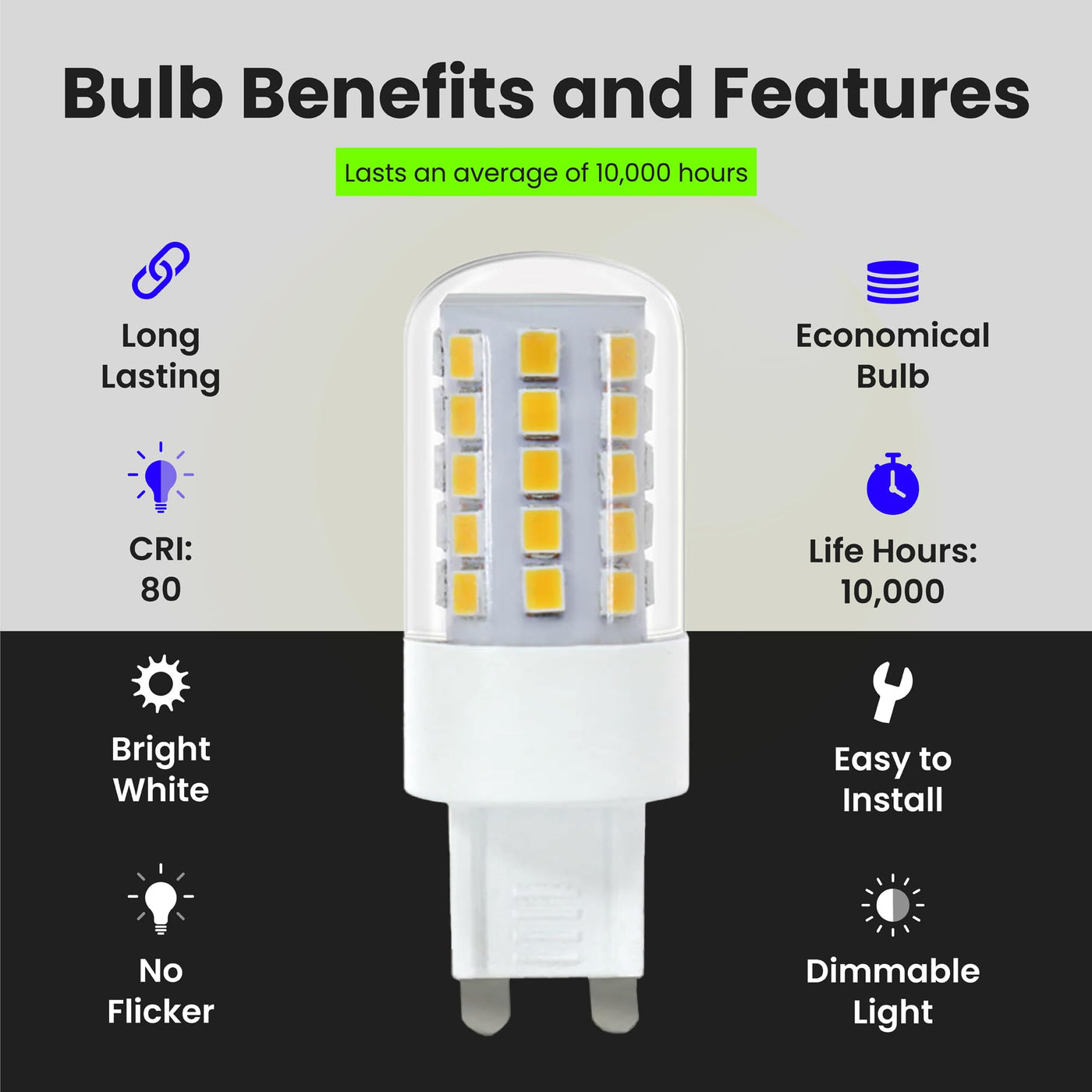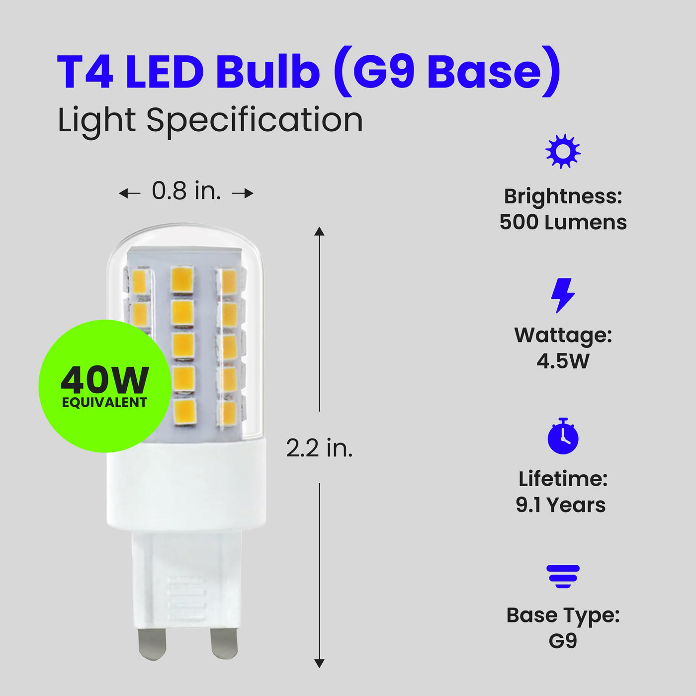 Enjoy All The Benefits Of Advanced Led Energy-Saving Technology With The Feit Electric Bpg940/830/Led 40W G9 Led Light Bulb. This 3000K Warm White Light Is Dimmable And Will Replace A 40-Watt Equivalent Incandescent Bulb. It Produces A Similar Light Output (500 Lumens), Uses 4. 5 Watts Of Energy And Up To 89% Less Energy Than A Standard Incandescent Light Bulb. Get Instant On To Full Brightness With Relatively Cool Running Performance. Feit Electric Wedge Bulbs Have An Average Life Of 10, 000 Hours / 9. 1 Years Are Rohs Compliant And Are 100% Mercury Free. Choose A Dependable Specialty Bulb For Residential Or Commercial Applications.